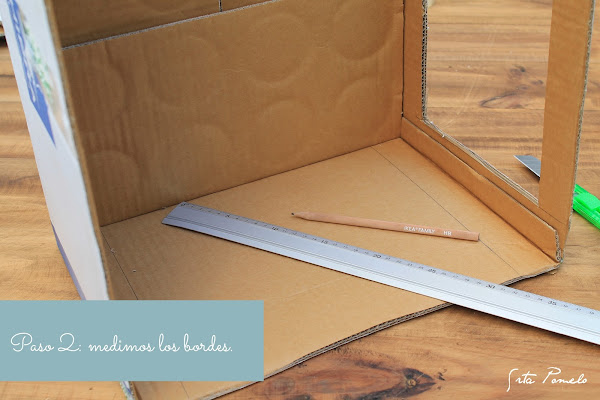 Pegamos la cartulina con una tira de celo dentro de la caja, dejando que haga una curva en el interior. Si la cartulina es más ancha que la caja, mediremos el interior de la caja y cortaremos a medida.
