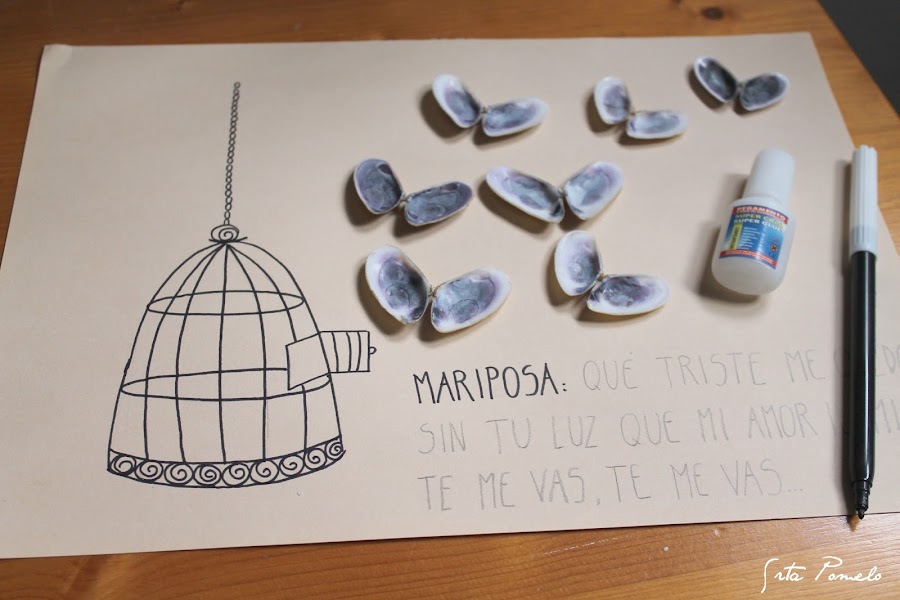 LO CONFIESO: anoche cenamos coquinas. ¿Qué son? Son esos moluscos que se pueden recoger en la orilla del mar y que salteados con aceite, ajito y perejil están de muerte (sé que en otras provincias se llaman de otra manera). Y claro...mi imaginación cayó en la cuenta. Una vez que te las comes, parecen mariposas. Y se me ocurrió la idea de hacer una lámina con ellas con una frase bonita.