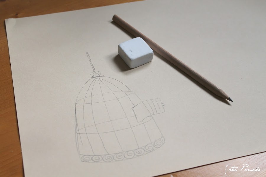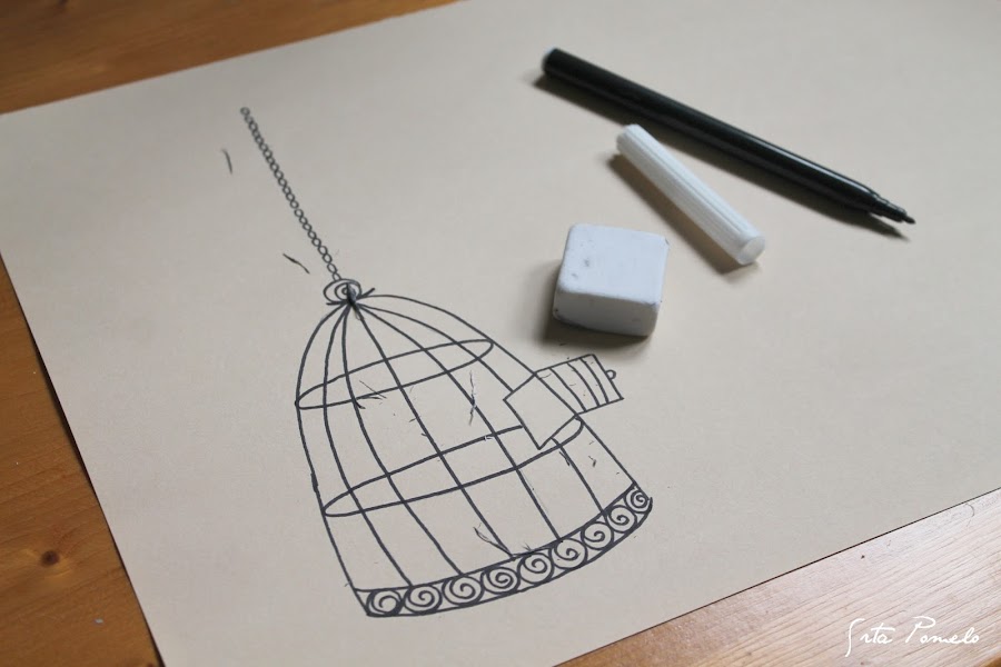 He empezado dibujando con lápiz (que siempre se puede rectificar) una jaula abierta. Es un dibujo muy simple, que no cuesta trabajo ni es muy pomposo. Unas líneas curvas y listo.