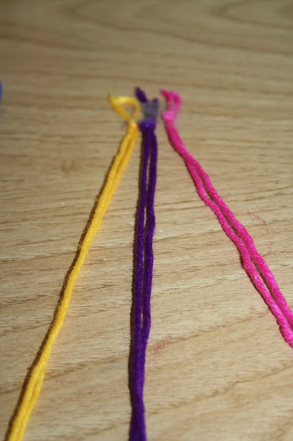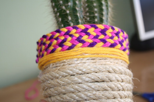 Con la lana de colores, haremos una trenza lo bastante larga para enrollarla varias veces sobre la maceta. Y seguimos pegando, pero esta vez por la parte superior.