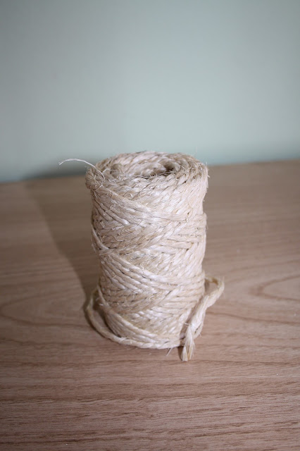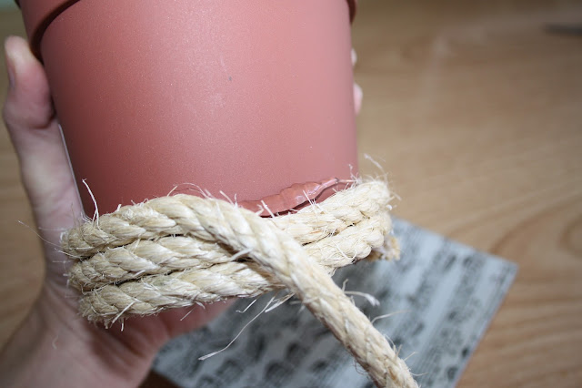 A continuación, con la cuerda más fina, seguiremos enrollando la cuerda y pegándola a la maceta.