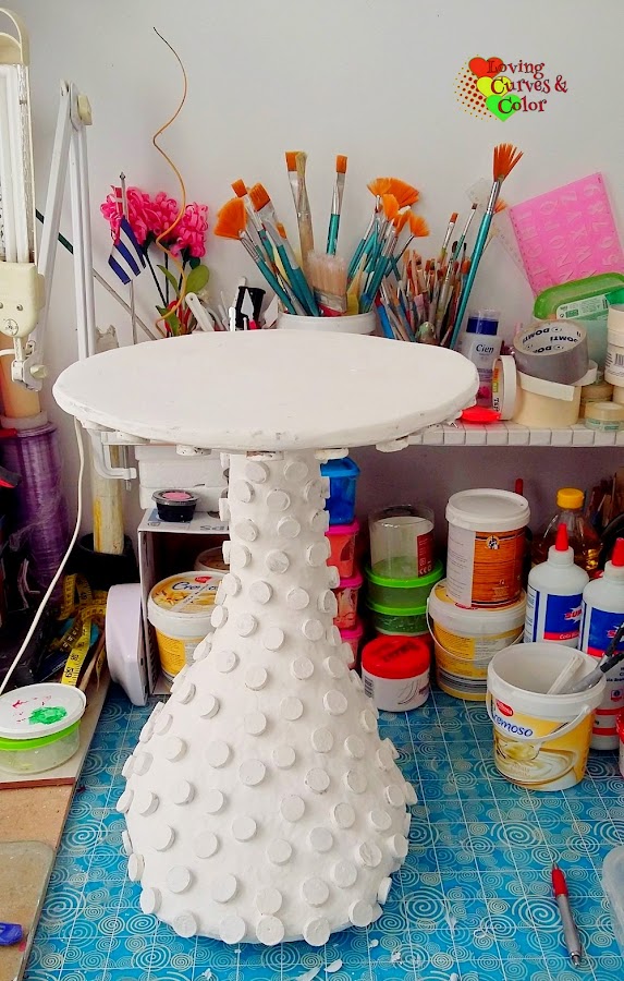 A la circunferencia que será la base o el pie de la mesa le iremos añadiendo papel hasta darle la forma que ves. Lo que será la base o pata de la mesa la haremos usando un alambre rígido o uniremos 2 tubos duros de papel de aluminio a estos los envolveremos en papel periódico cuando tengamos el grosor deseado lo uniremos a la base que hicimos antes con la otra circunferencia y los pegaremos con silicon caliente, en el otro extremo pegaremos la otra circunferencia.