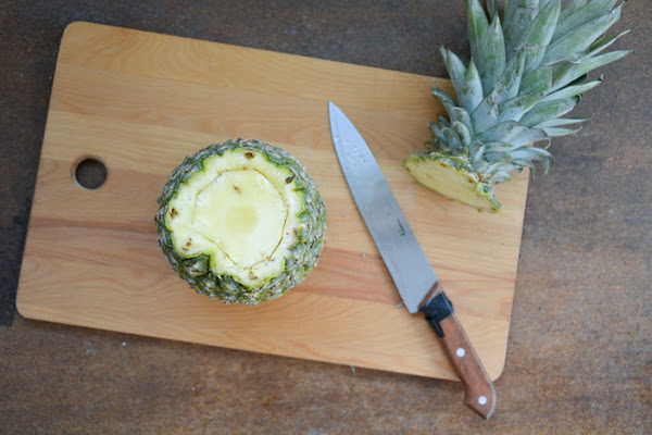 Para vaciar la piña podéis usar lo que mejor os vaya. Yo he estado alternando entre un cuchillo y un pela patatas porque no tenía nada mejor, pero la verdad que no me ha costado demasiado. Aunque la parte central sí que está un poco más dura y tuve que destrozarla un poco xD. No dejéis las paredes muy finas para que luego se sujete bien y no se doble, sobre todo si vais a abrir huecos muy grandes para la boca.