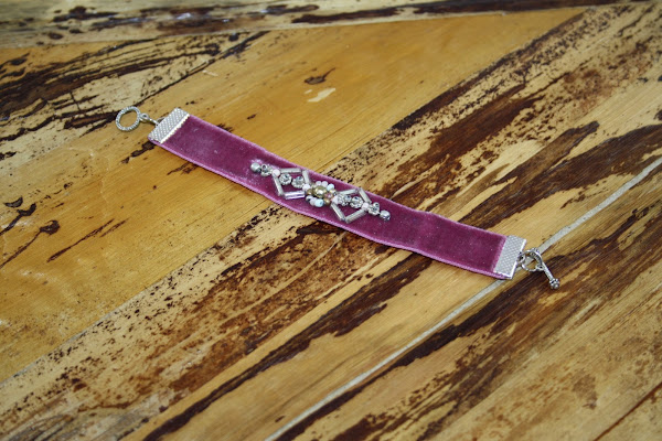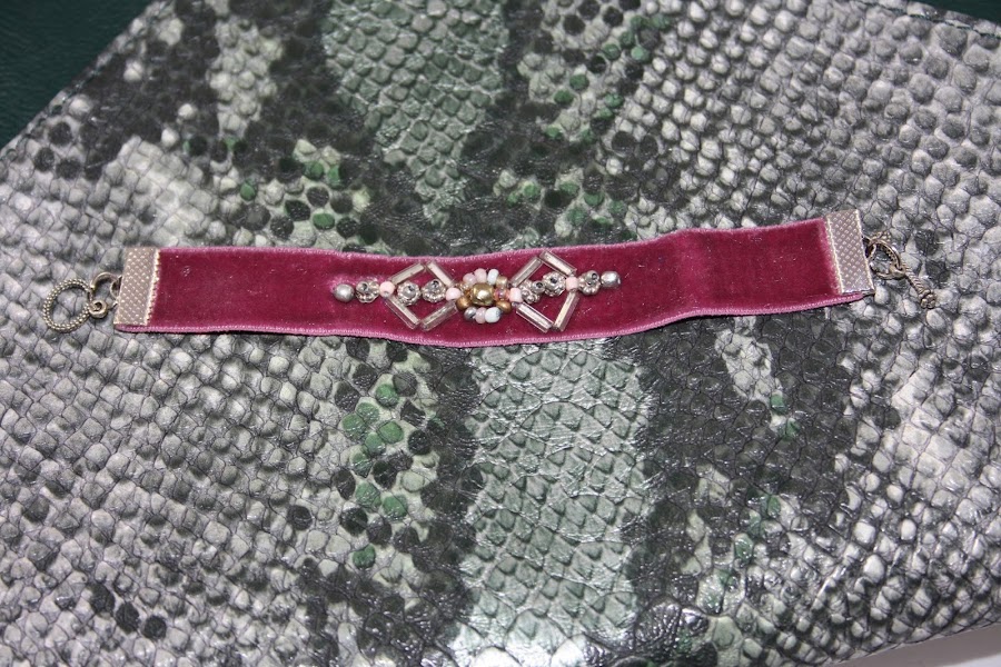 Usaremos una cinta de terciopelo elástica, tupíes de varios colores y tamaños, dos anillas, aguja e hilo, un cierre de pulseras y dos terminales metálicos.