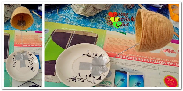 Cuando este seco todo el papel, une la parte del asa con cinta de carrocero para que quede esa parte cerrada. Debe quedar como la segunda foto.