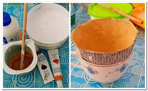 Cuando este bien sequita la taza de papel, la revestiremos con hilo, yo usé de lana, pero puedes usar otro tipo de hilo o bien solamente pintar la taza y hacerle dibujos a tu gusto.