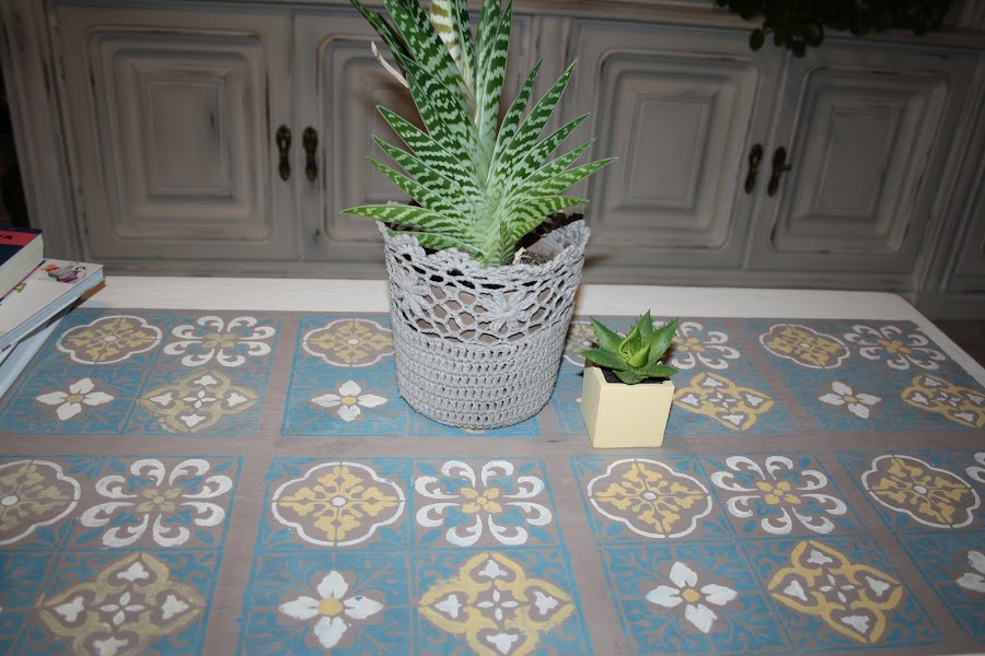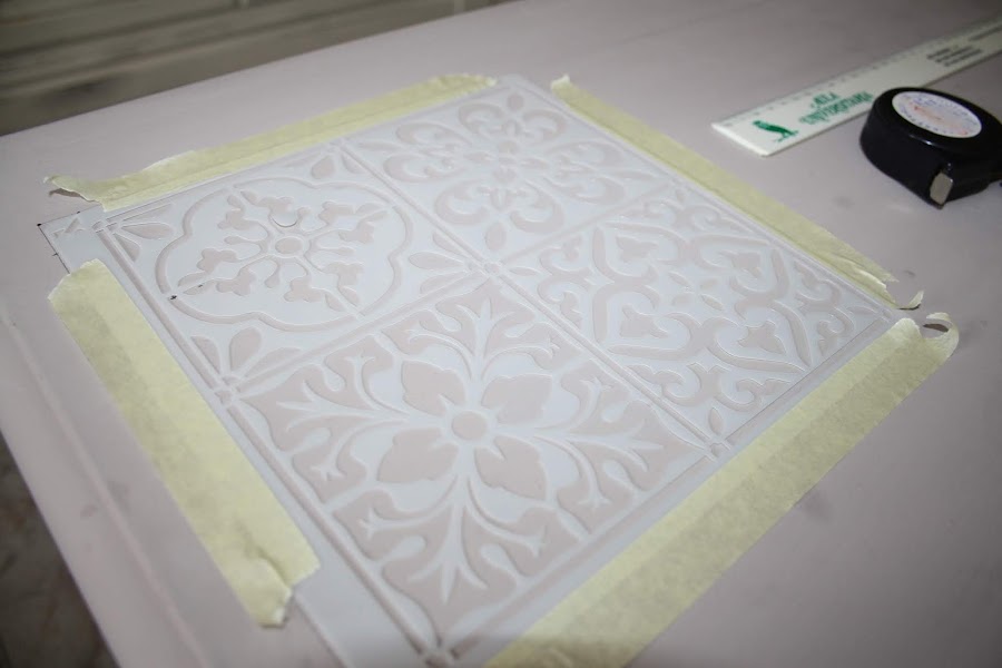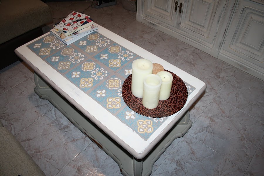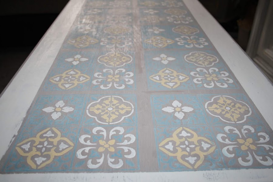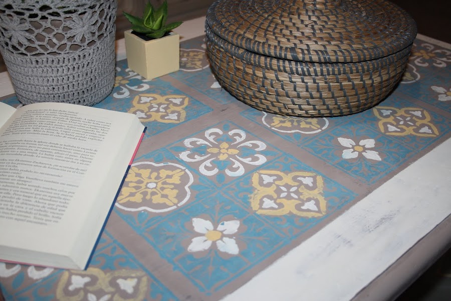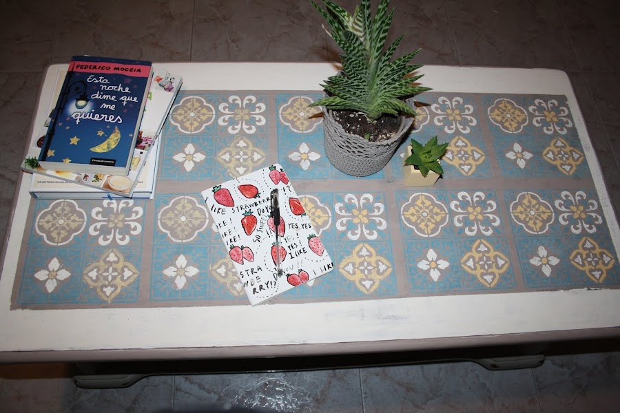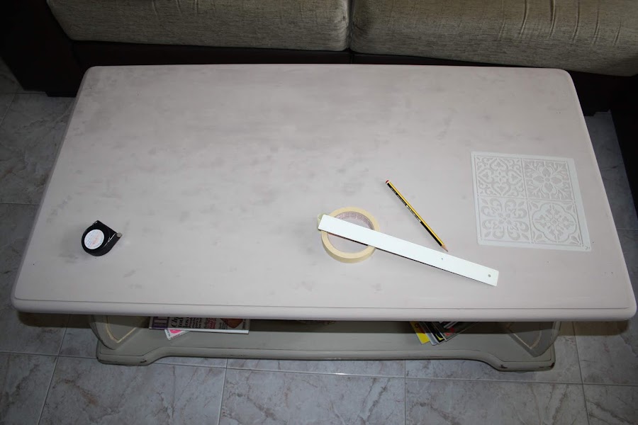 Tras este paso, medimos nuestra plantilla de stencil para hacer nuestras baldosas hidráulicas. Hay que medir muy bien ya que la plantilla no nos va a cubrir toda la mesa y la parte que sobre ha de ser la misma alrededor de la mesa.