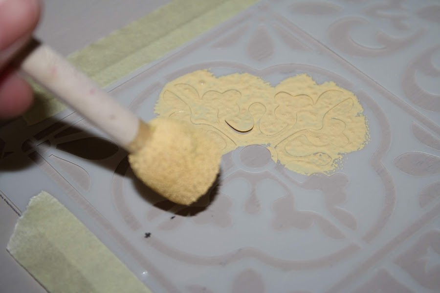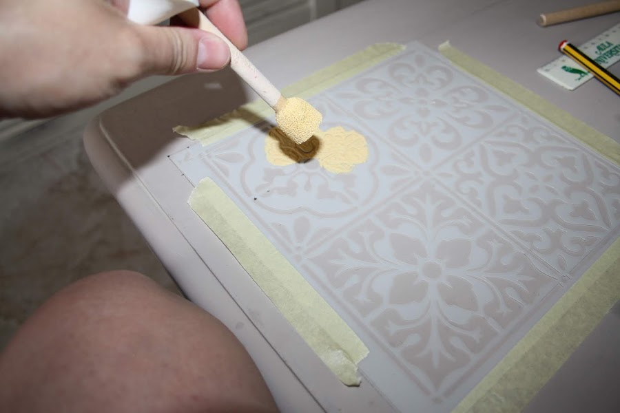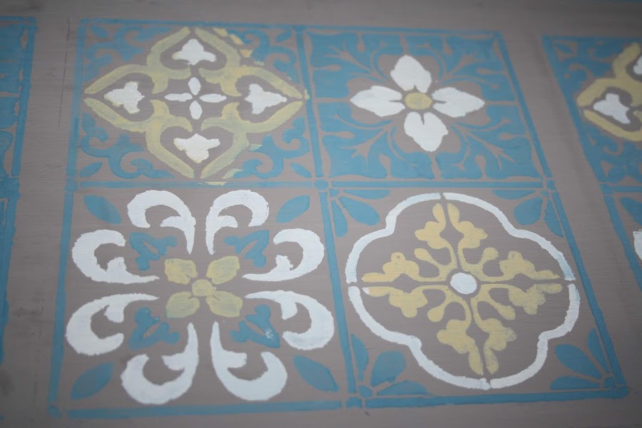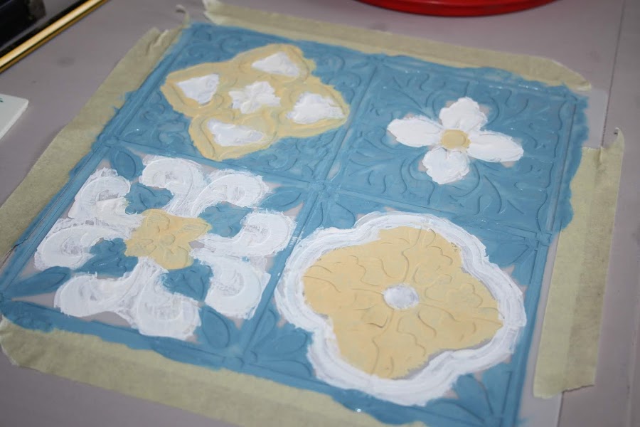 Pegamos la plantilla con cinta de carrocero y comenzamos a pintar. Acordaros de escoger los colores que vais a poner ya que los azulejos han de quedar siempre igual pintados.