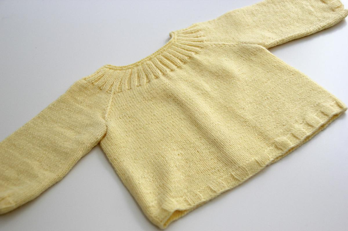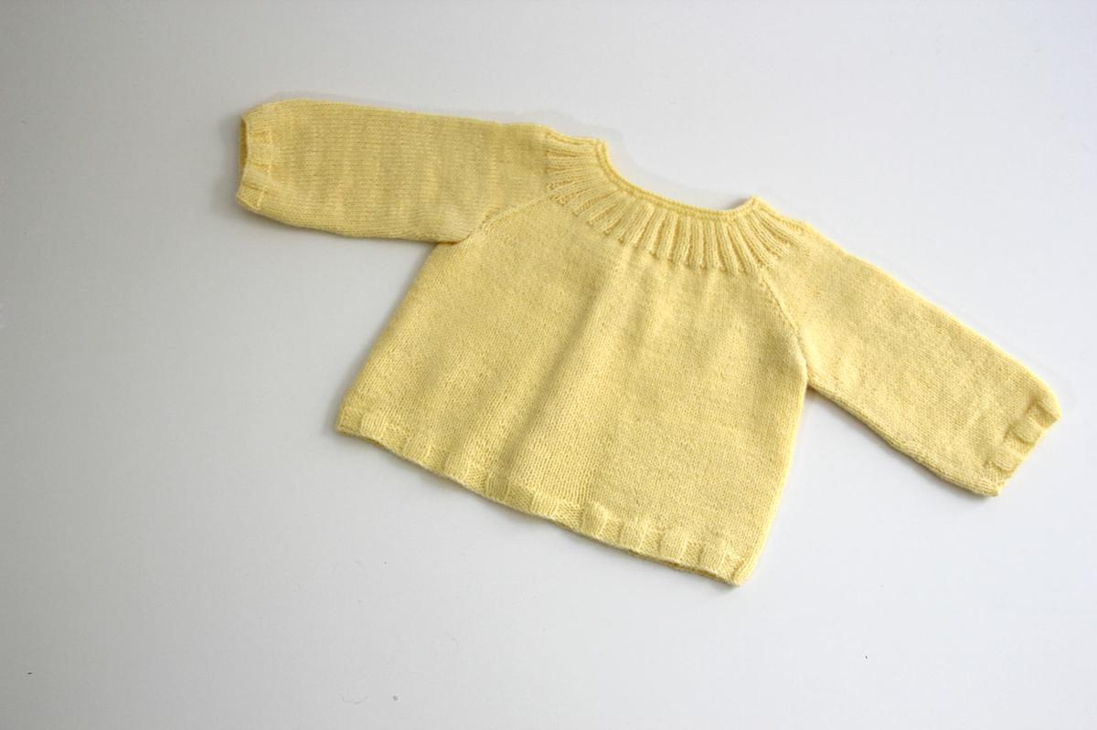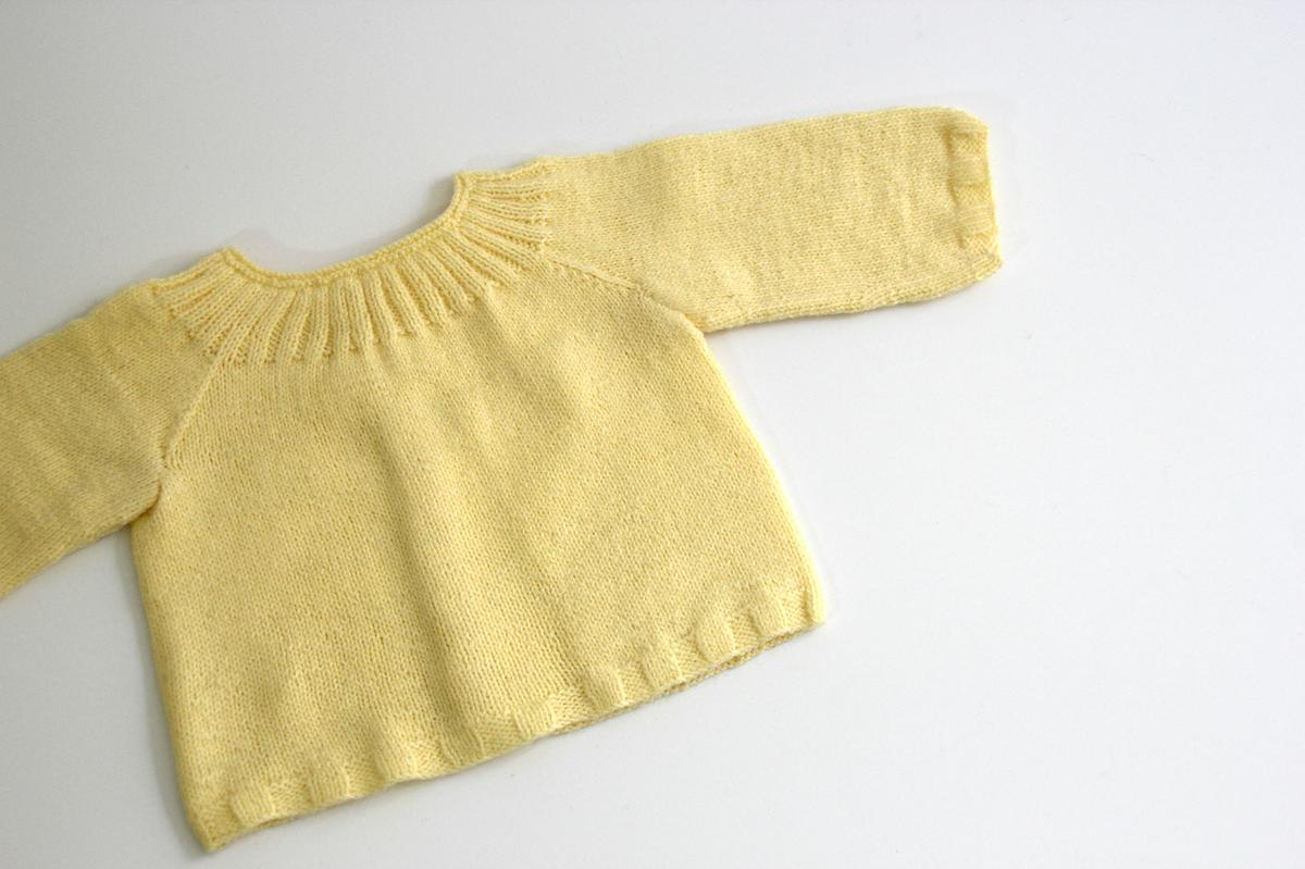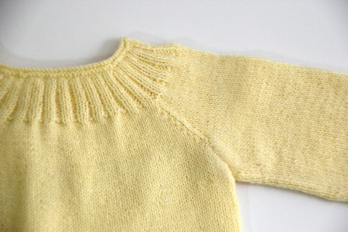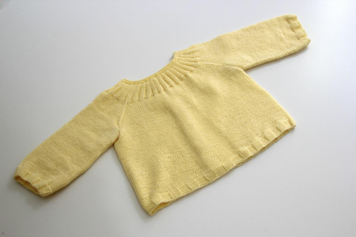Este jersey tan bonito se lo hice a Jorge a finales de verano, cuando aún no sabía si sería niña o niño ya comencé a tejer en amarillo, que es un color unisex. Quería desde hace mucho tiempo un jersey con esta forma, en patente por la parte del cuello, y la verdad que el patrón no lo he encontrado en ningún sitio, así que me lo he ido inventado.