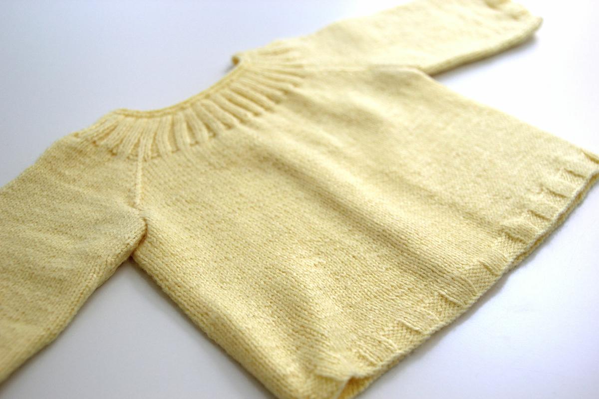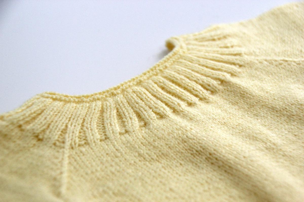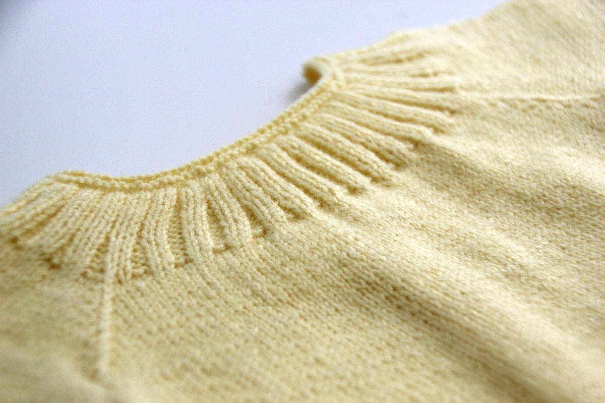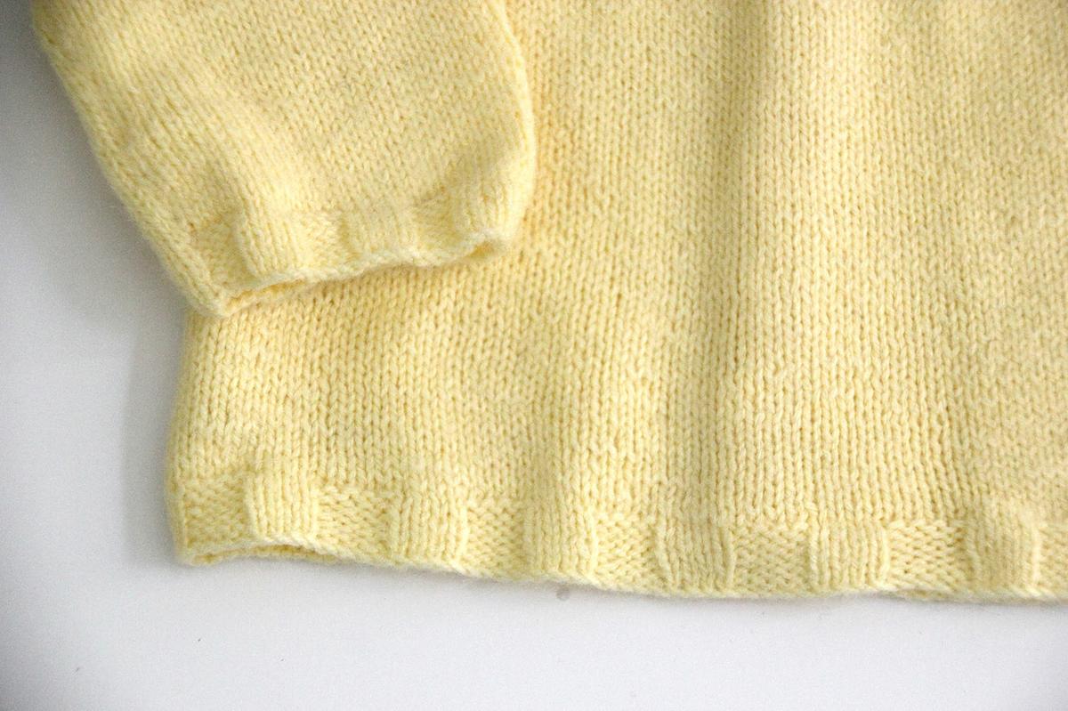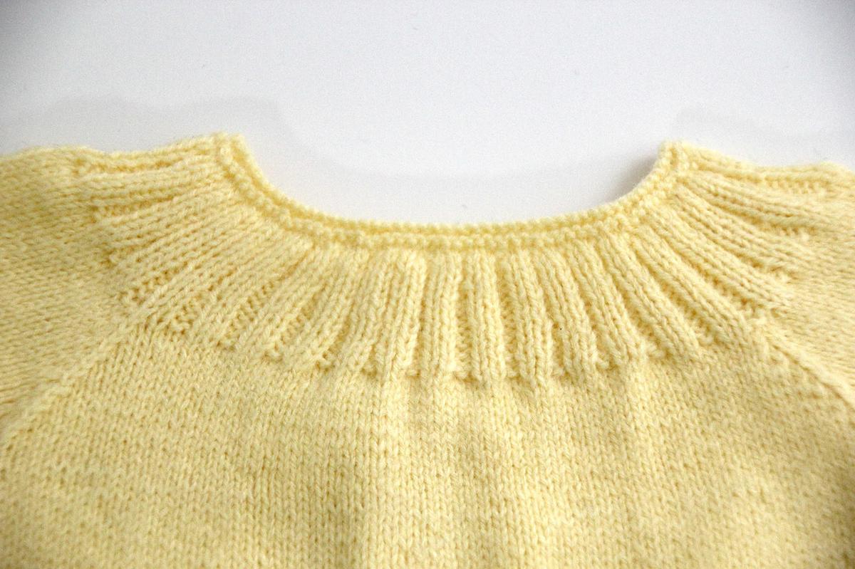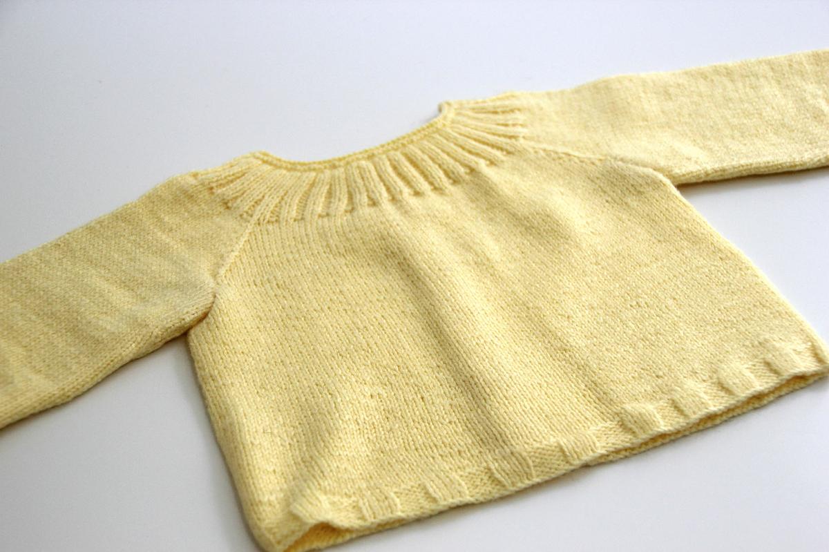 Este jersey tan bonito se lo hice a Jorge a finales de verano, cuando aún no sabía si sería niña o niño ya comencé a tejer en amarillo, que es un color unisex. Quería desde hace mucho tiempo un jersey con esta forma, en patente por la parte del cuello, y la verdad que el patrón no lo he encontrado en ningún sitio, así que me lo he ido inventado.