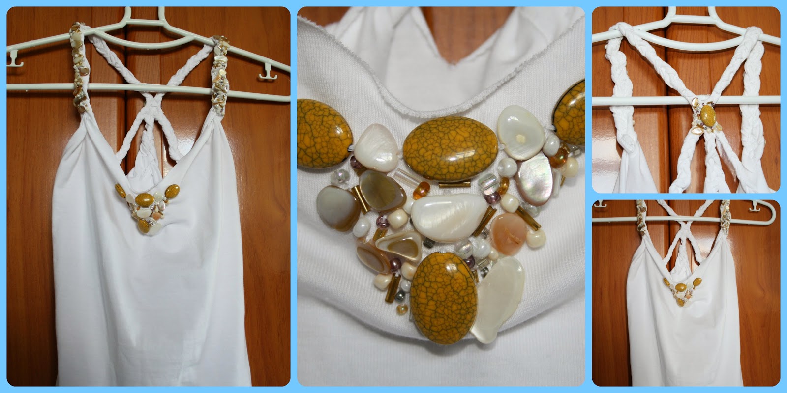 Una vez acabado embellecí los tirantes y la parte del pecho con más abalorios, tipo concha para darle un toque más playero a la camiseta.