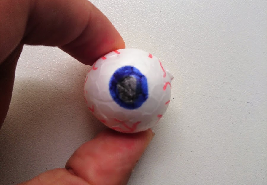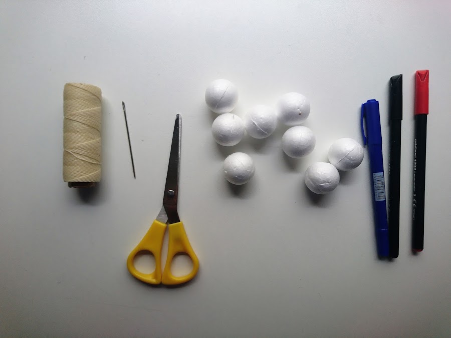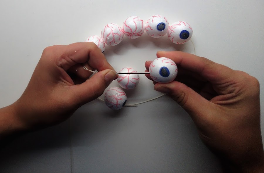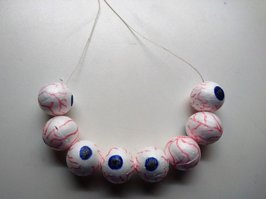 Empezamos coloreando la pupila, el iris y las venitas a cada bola de porexpan. Cuando estén listas y el rotulador se haya secado, vamos a enhebrar cada "ojo" en el cordón con ayuda de una aguja. Una vez que hemos insertado todas las bolas en el cordón atamos un nudo y ¡Listo!