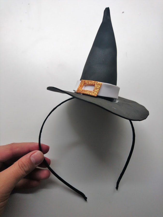 Pegamos ambas piezas y decoramos con una cinta y una hebilla de gomaeva también. Por último pegamos el sombrerito a la diadema y estaría listo.