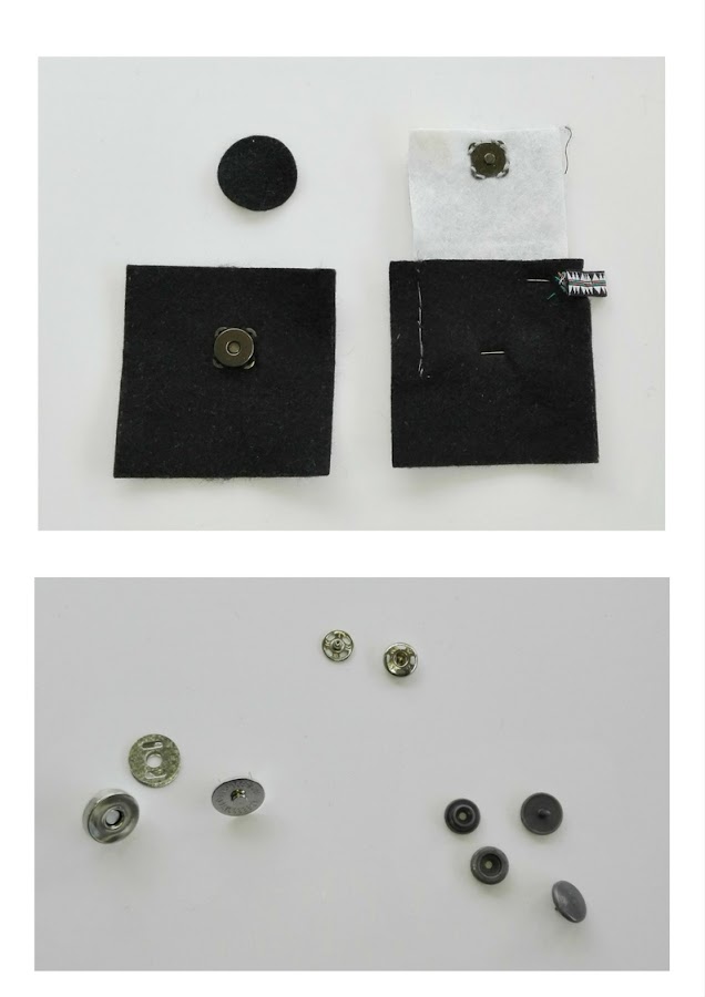 Una vez tenemos estas primeras piezas ya montadas, podemos poner el tipo de botón que tengamos a mano y coserlo en el lugar adecuado del cuadrado 2 y del rectángulo que es la tapa.