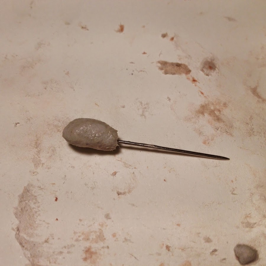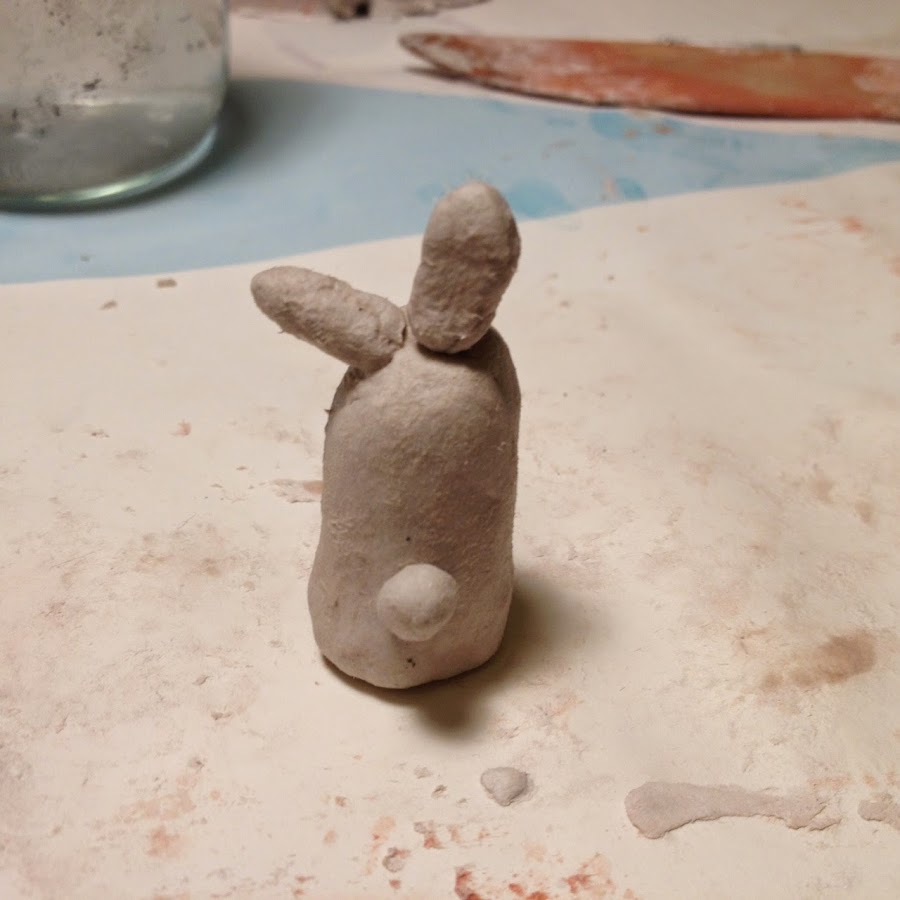 Cuando hayamos acabado con el cuerpo hacemos las orejas y la cola. Para ello, hacemos dos "churritos" para las orejas y una bolita para la cola y para pegarlos simplemente humectamos un poco la zona del cuerpo donde queramos ponerlo y presionamos. Si veis que no sois capaces de que se mantengan poned un alfiler dentro de la oreja y ancladlo al cuerpo.