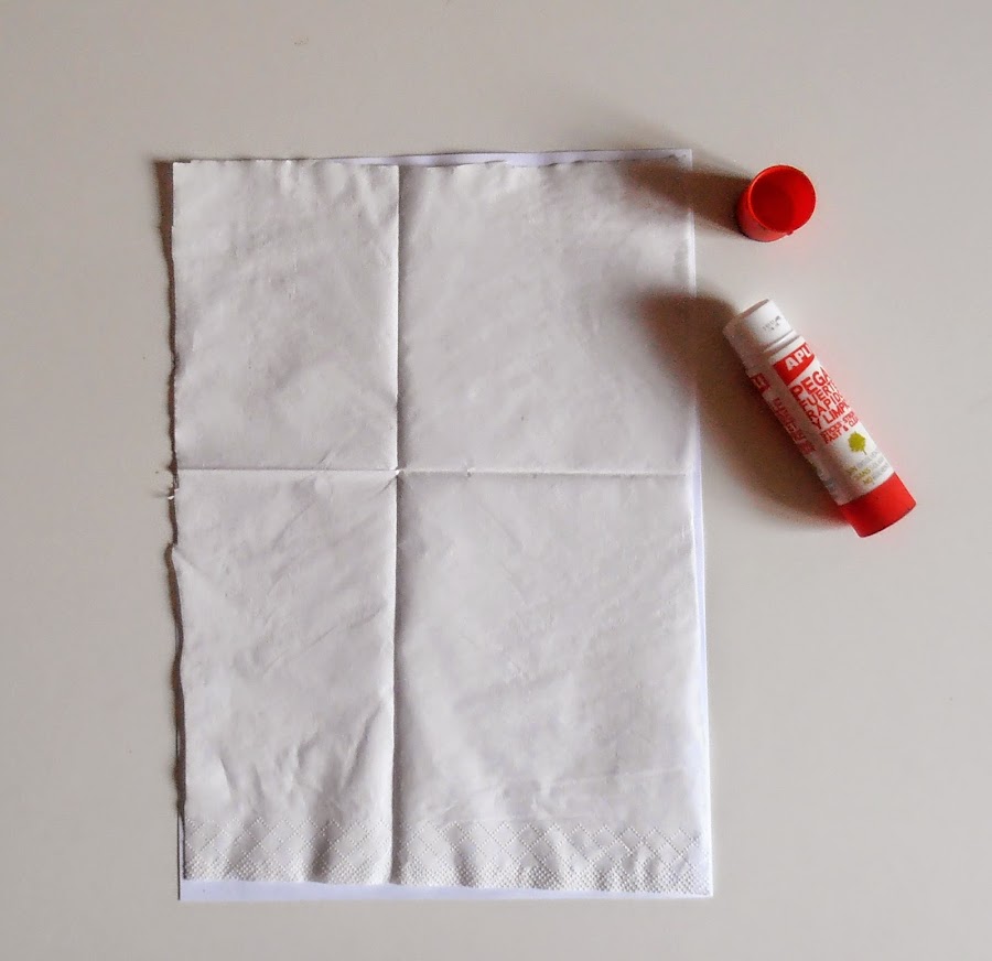 Recortamos la servilleta al tamaño del folio. Ponemos pegamento,