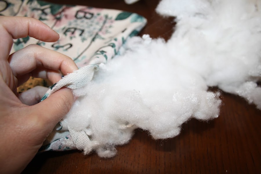Metemos la guata con la mano. Es mejor que quede gordito, así que no os cortéis a la hora de rellenarlo. Si no tenéis guata, podéis emplear espuma cortada en trozos muy pequeños.