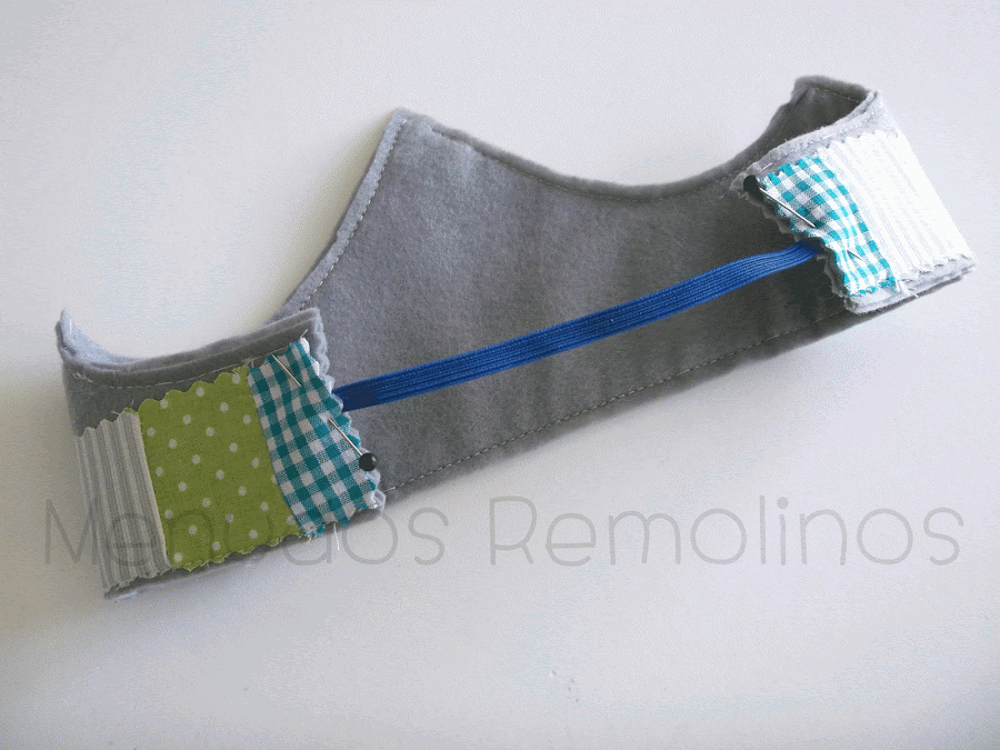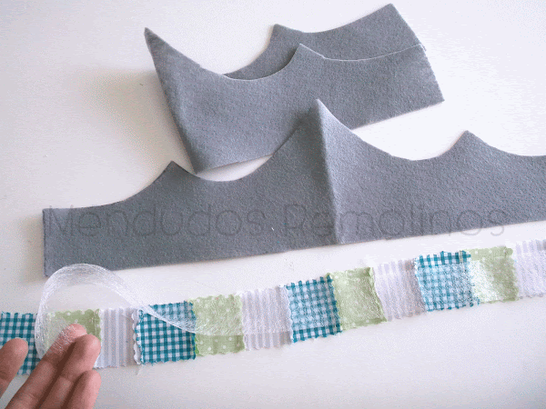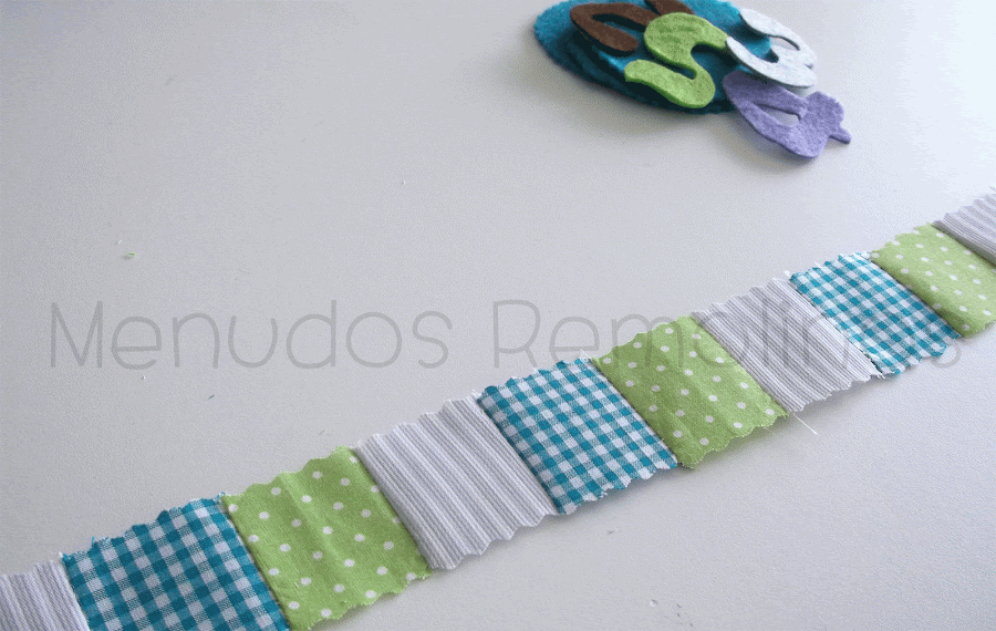 Los trocitos de tela los unimos bien a mano o con la máquina de coser. Ponemos una tira de fiselina de doble cara entre la tira y la plantilla de fieltro y fijáis con la plancha.