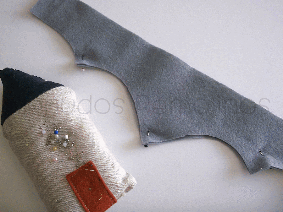 Cogemos un trozo de goma y lo ponemos entre cada una de las capas de fieltro. Cosemos