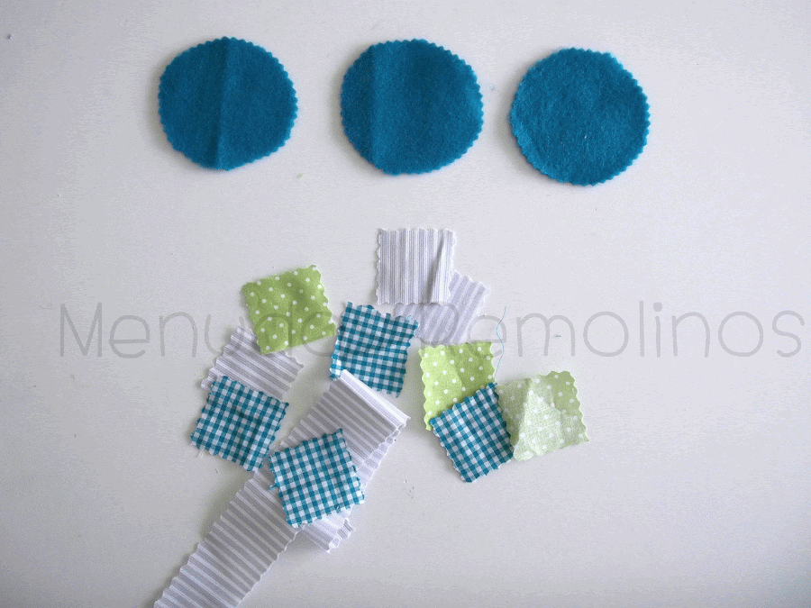 Por otro lado, tenemos que recortar varios círculos de fieltro de otro color. El tamaño que yo he usado es el de un vaso de agua. Recortar también trocitos de las telas que vayáis a combinar. Los míos tienen un tamaño de 4x4 cm. Los podéis hacer más grandes. Más pequeños no porque es difícil para coserlos.