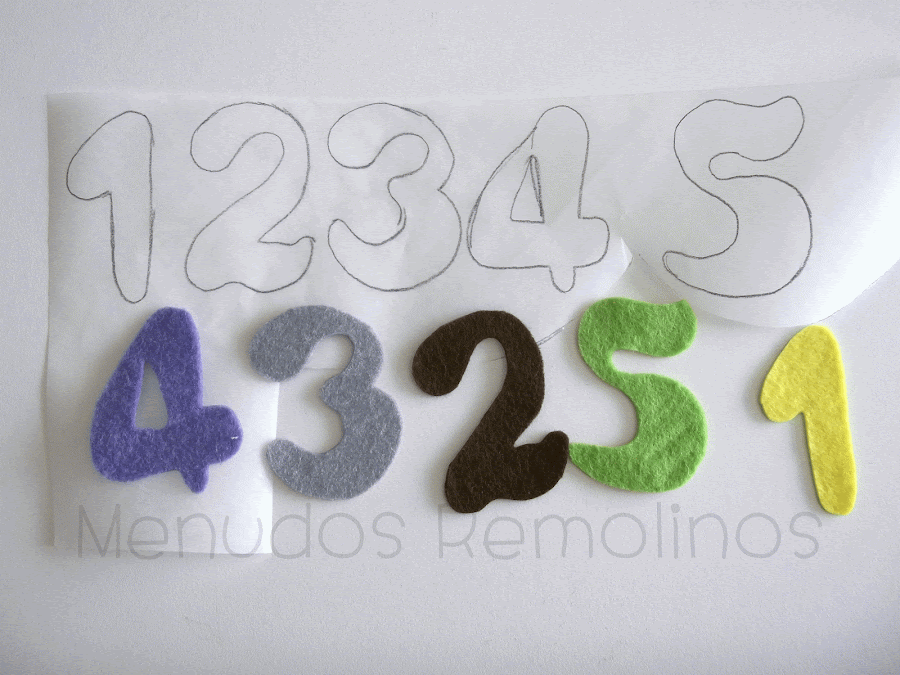 Fijamos el papel de aplicaciones en el fieltro con la plancha, y recortamos los números.