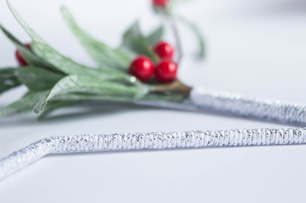 Ahora tenemos que cubrir toda la estrella metálica, que hará de base, con nuestro cordón blanco y plateado. Para ello comenzamos por la parte de arriba y vamos dando vueltas con el hilo sobre el metal poco a poco y prestando atención a que quede bien juntito para que no se vea ninguna zona negra del metal.