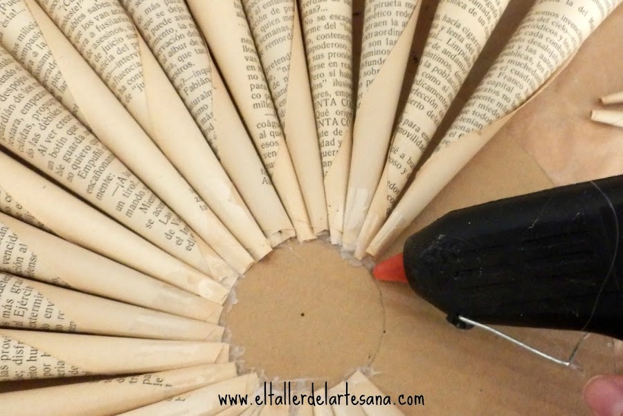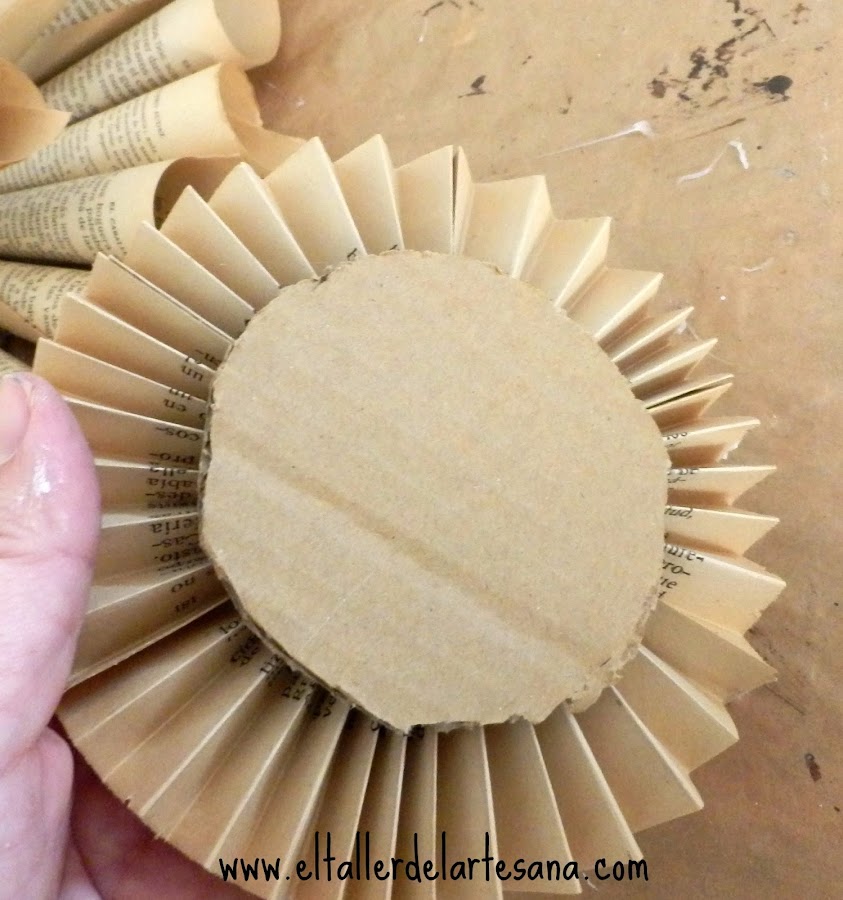 Ahora ya podéis empezar a pegarlos al cartón. Yo he utilizado silicona pero también podéis utilizar grapitas porque luego van a taparse con la otra fila. Si hacéis un círculo en el centro os servirá de guía para que todas vayan a la misma altura.
