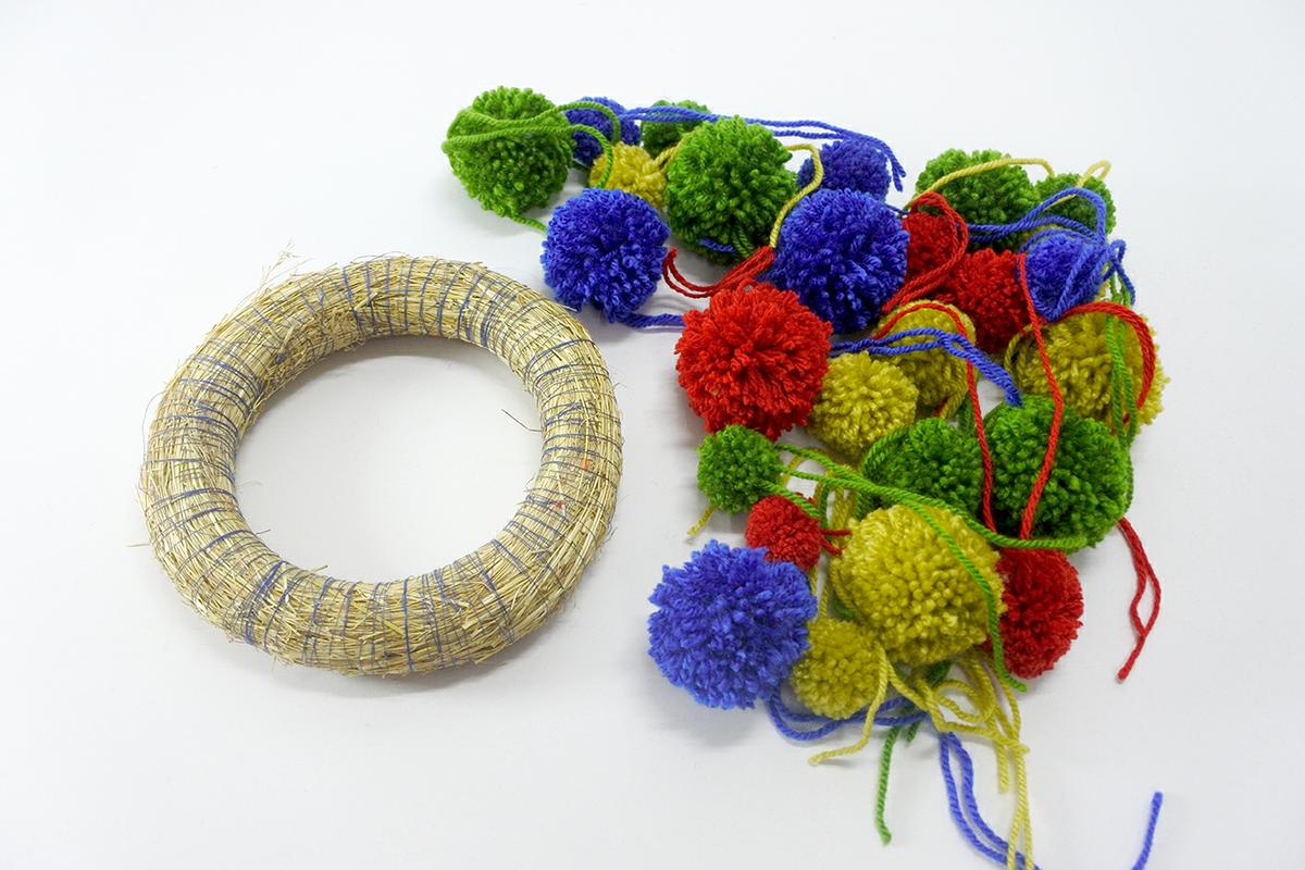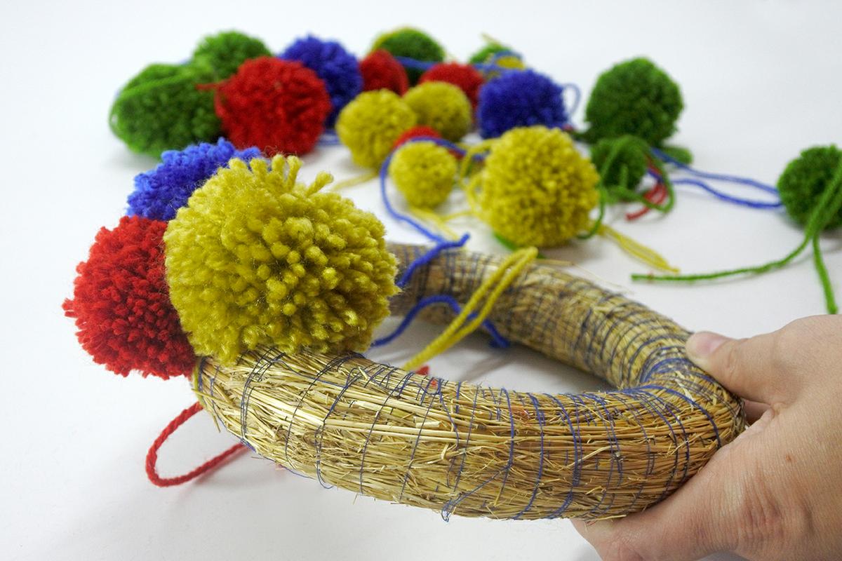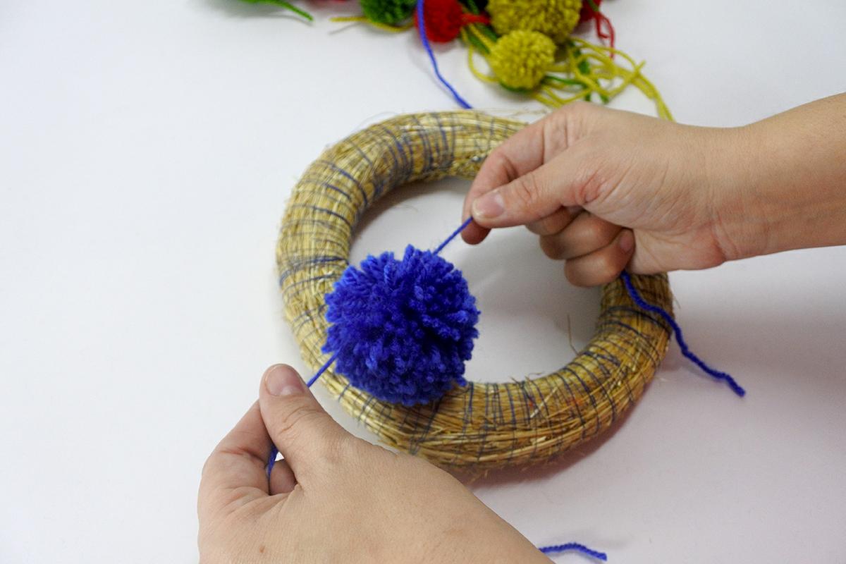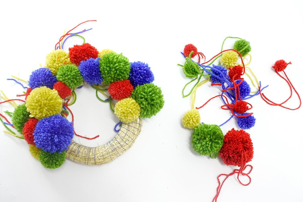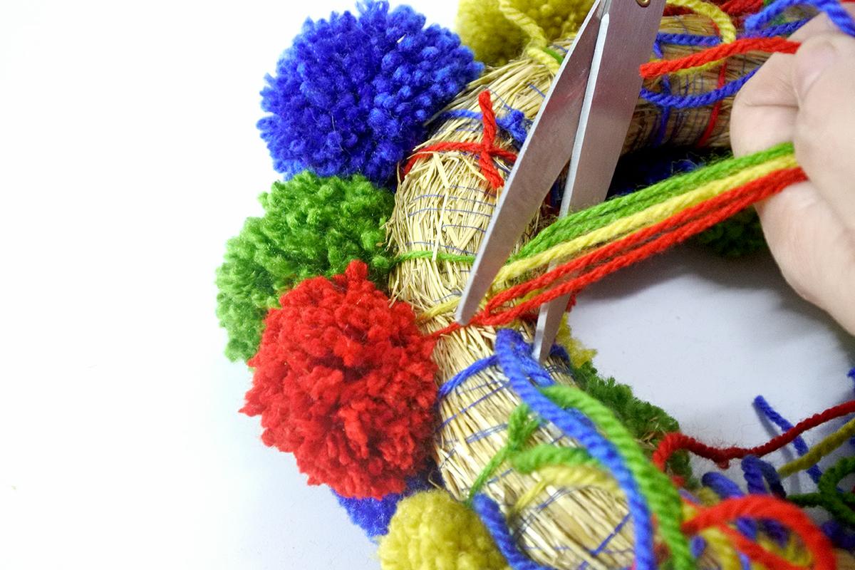 Una vez tenemos nuestra corona lista y repleta de pompones, le damos la vuelta y cortamos todos los sobrantes de lana.