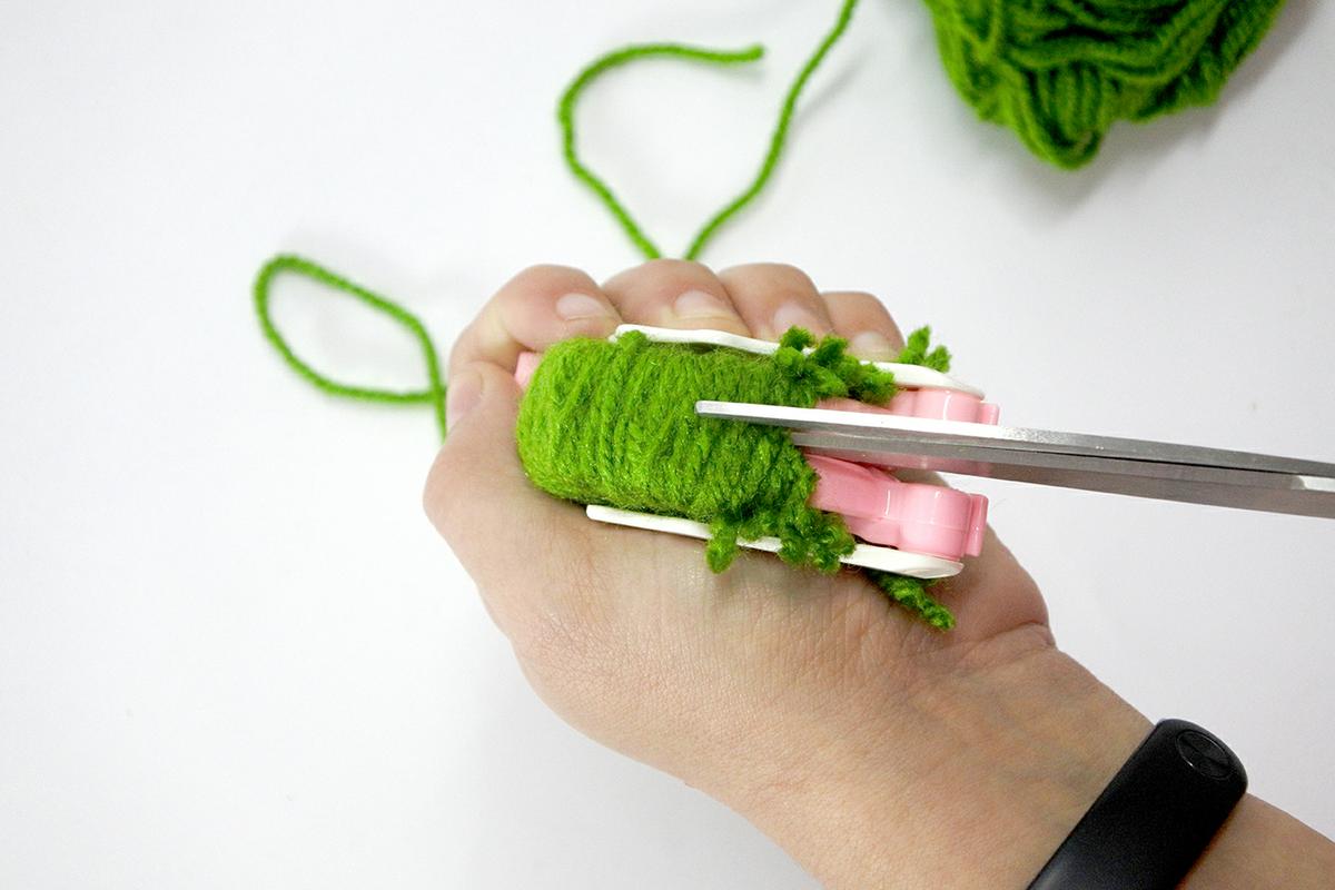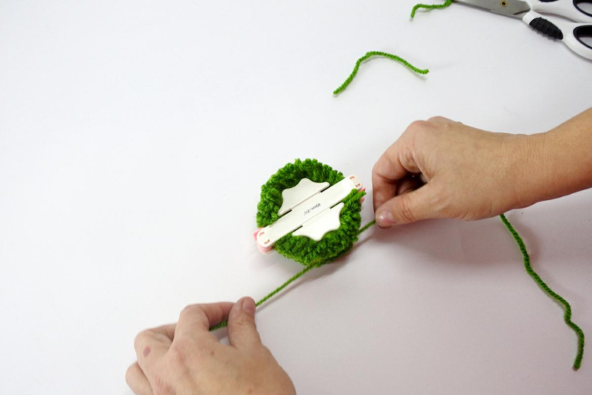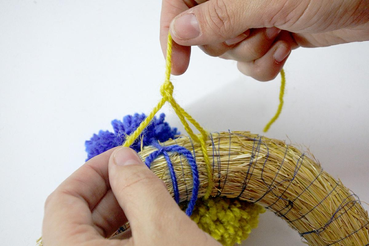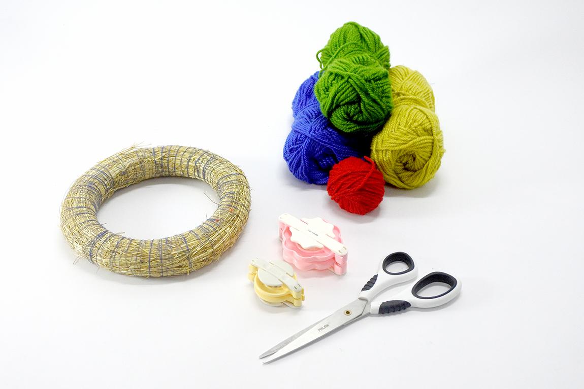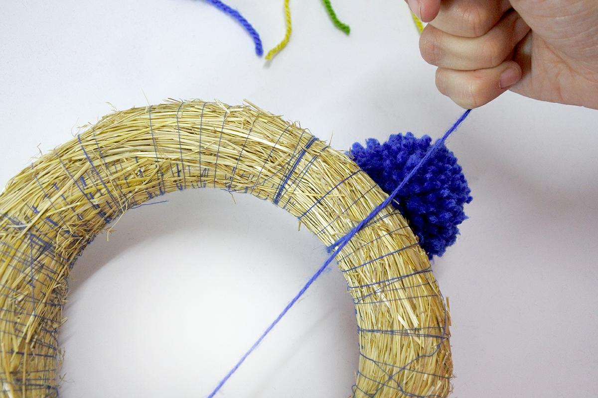 Una vez tenemos nuestra corona lista y repleta de pompones, le damos la vuelta y cortamos todos los sobrantes de lana.