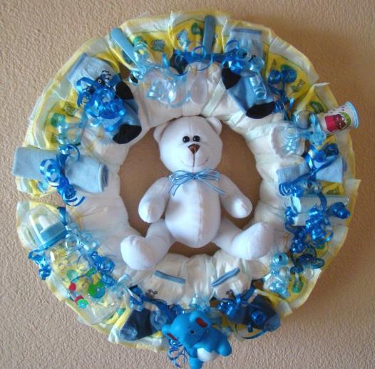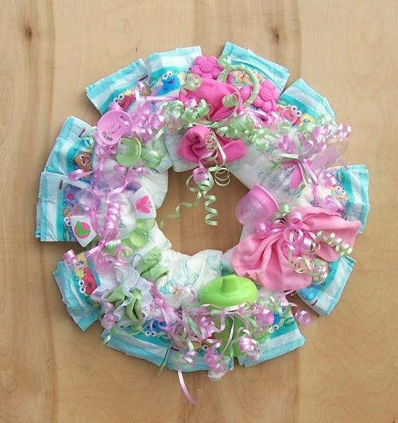 a) Forrar el circulo de carton o mimbre con los pañales, uno al lado del otro, con la parte de la cintura (del pañal) hacia afuera, atandolos unos con otro con cinta de regalo.