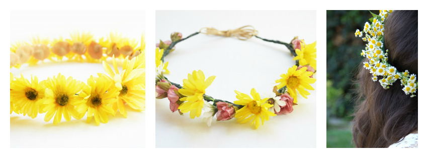 Siguiendo con las flores artificiales pero utilizando margaritas conseguimos unas sencillas coronas de estilo hippie ideales para fiestas ibicencas o festivales musicales.