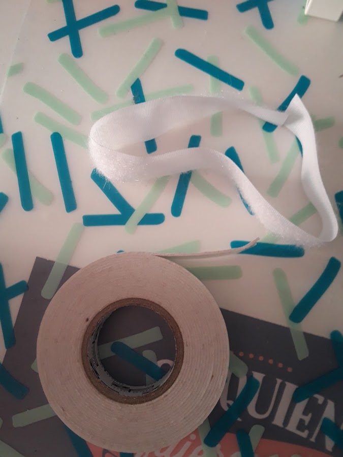 Mi velcro no era adhesivo, por lo que tuve que idear un método para pegarlo a la tela y al trozo de madera. Así que me hice con una cinta de doble cara y con silicona para adherirlo a estas zonas: