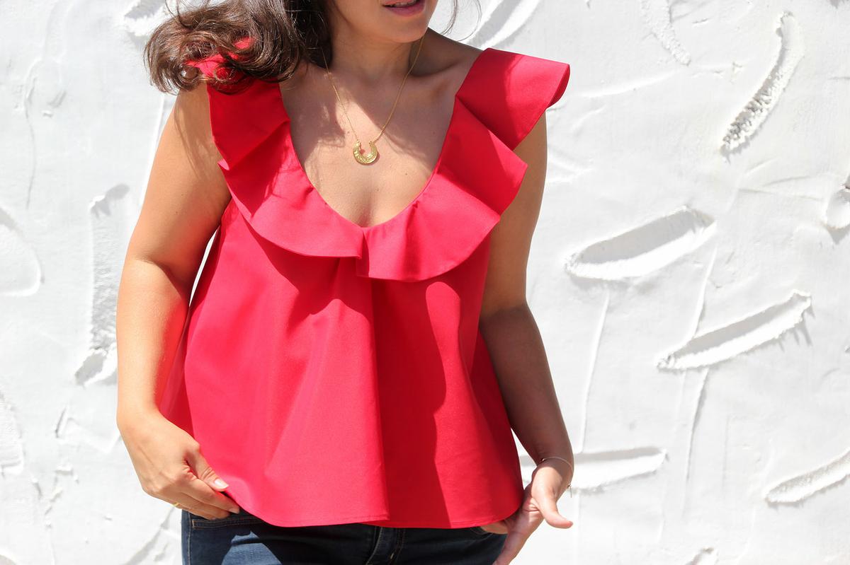 La tela perfecta para esta blusa es la típica tela camisera o popelín!!!! Yo la compré en TiendaTelas.com, en color rojo pero tenéis más colores y estampados!!!