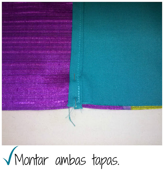 Es hora de montar la funda de cojín, pero de verdad. Para hacerlo, hay que montar las dos piezas traseras por el lado del revés sobre la cara principal de la tapa delantera para después pasarlo a la máquina. Para no confundiros pensad que deben pegar lado bueno contra lado bueno, es decir, que según lo tenéis posado en la mesa, frente a vosotr@s debe estar el "derecho" de la tapa delantera y el "revés" de las tapas traseras.