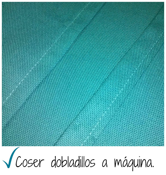 Llega el primer asalto a la máquina de coser, ¿list@s? De momento es muy fácil, sólamente tenemos que coser los dobladillos que acabamos de marcar y sujetar. Una línea recta a puntada media en cada una de las dos tapas traseras (recordad que sólo lo tenéis que hacer en uno de los lados, el que va a quedar en el medio).