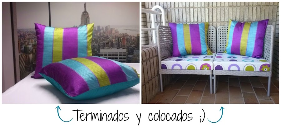 Y estos son nuestros dos cojines terminados en la tienda y en su destino definitivo, el nuevo sillón de terraza de mis niños que están súper contentos con su nuevo asiento reservado para la cena ;) De hecho les ha gustado tanto que es posible que este invierno en lugar de en el garaje acabe en algún rincón de casa pero... eso será otro post ;)