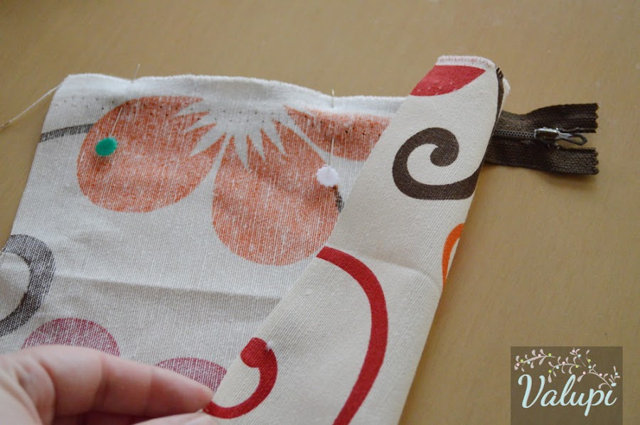 En nuestro caso usamos una cremallera de 16 cm. así que nuestro tozo de tela medía 23 x 20 cm.Comenzamos colocando la cremallera sobre nuestra superficie de trabajo mirando hacia arriba y encima ponemos nuestra tela con el derecho mirando hacia abajo. Centramos la cremallera, hacemos coincidir el borde superior de la tela con el borde superior de la cremallera y sujetamos con unos alfileres.