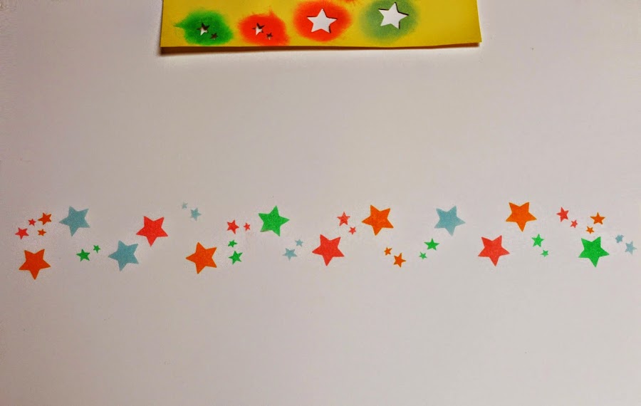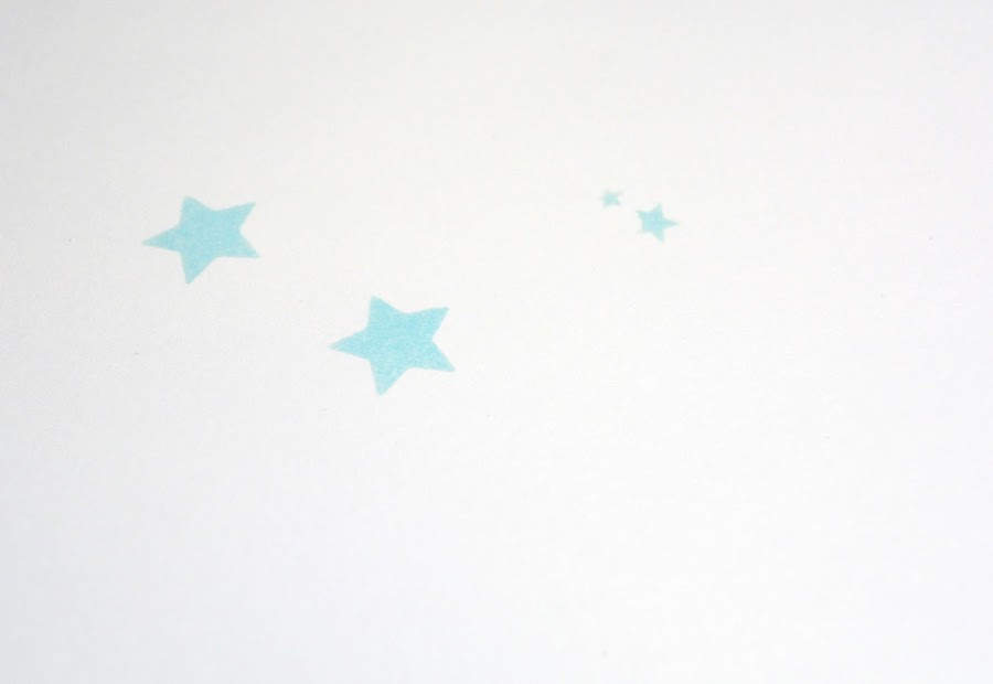 Luego, simplemente mojaremos la esponja en la tinta y utilizaremos nuestra plantilla para estampar nuestros sellos de estrellitas. Yo he utilizado un papel en blanco, que luego recortaré y utilizaré para adornar un paquetito.