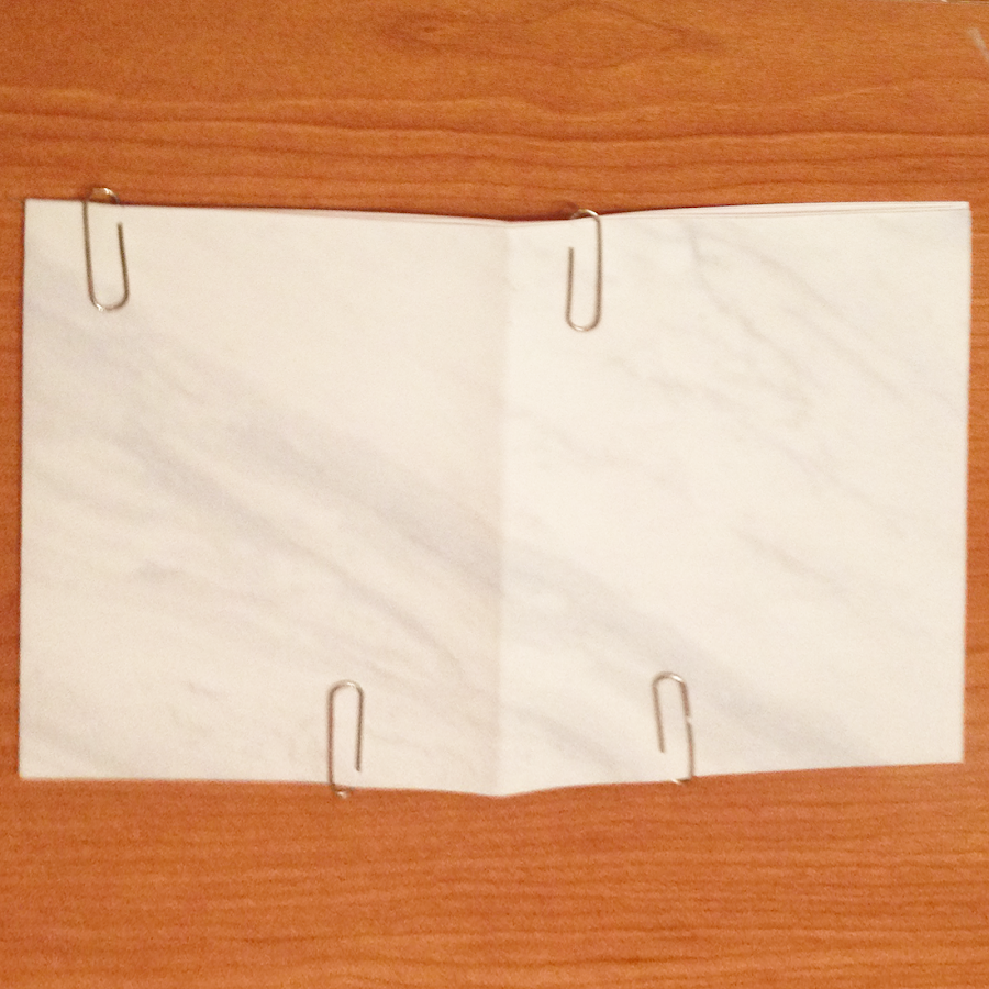 - Colocamos todos los folios que habíamos cortado y la cartulina y los doblamos de nuevo por la mitad.