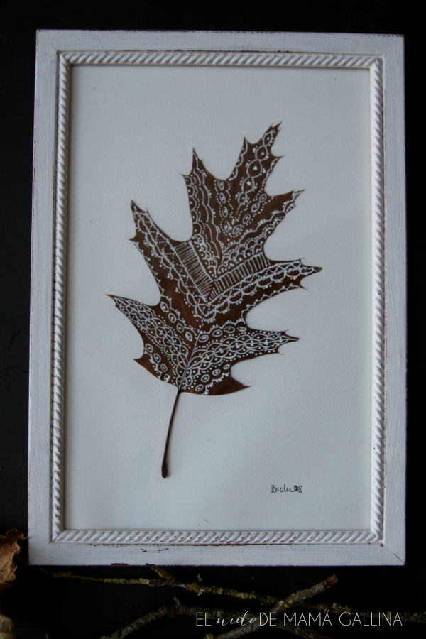 Respecto a los dibujos me he guiado por los nervios de las hojas para hacer los diseños, pero dejando volar la imaginación. Siempre es más fácil usar un patrón repetitivo para empezar, como el que he usado en la hoja pequeña y queda igualmente bonita.