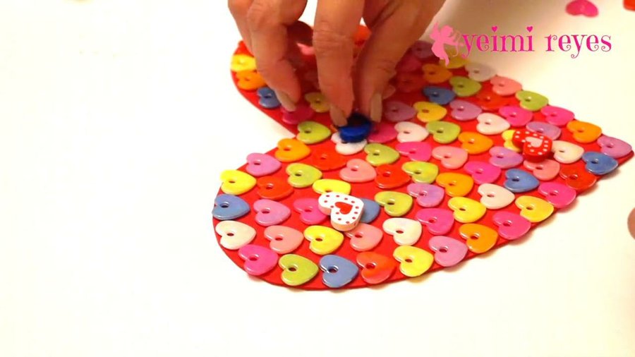 decora el corazón con los botones de plástico o madera que te comente en los materiales, de preferencia que sean de distintos colores.