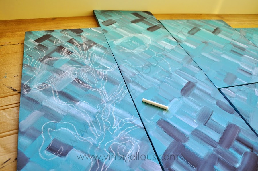 Una vez todo pintado pasamos a marcar el dibujo con una tiza. Nos decantamos por unas flores que vimos aquí.