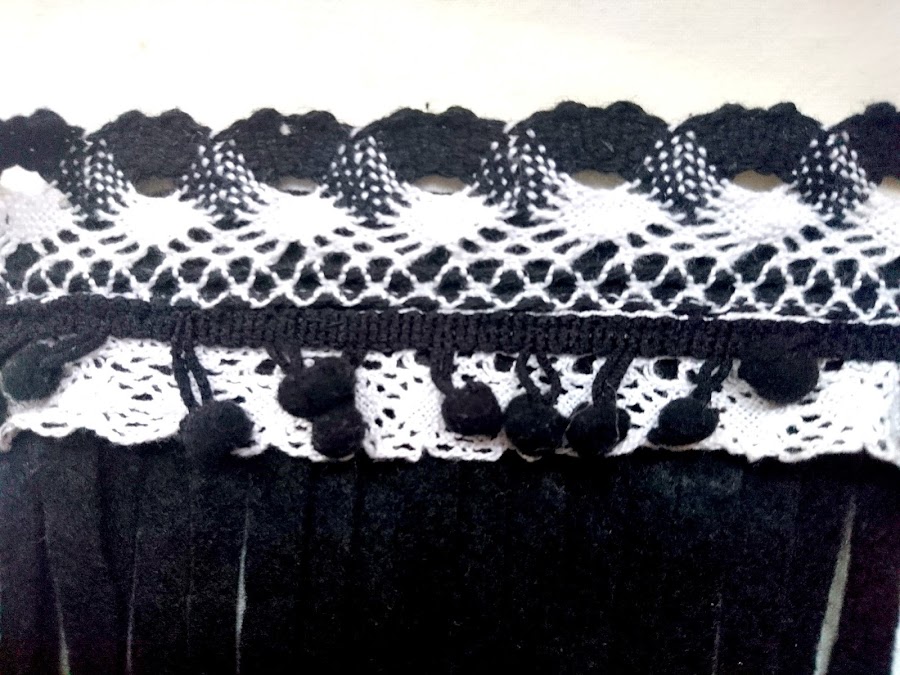 Ahora pasamos a coser las puntillas, yo las uní entre ellas primero y luego las cosí al fieltro. También coloqué en el centro de las dos puntillas los madroños y cosí las plumas a continuación de las puntillas en la zona central del cubrebotas.