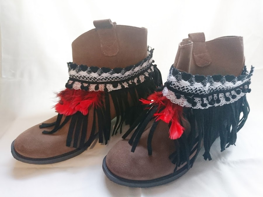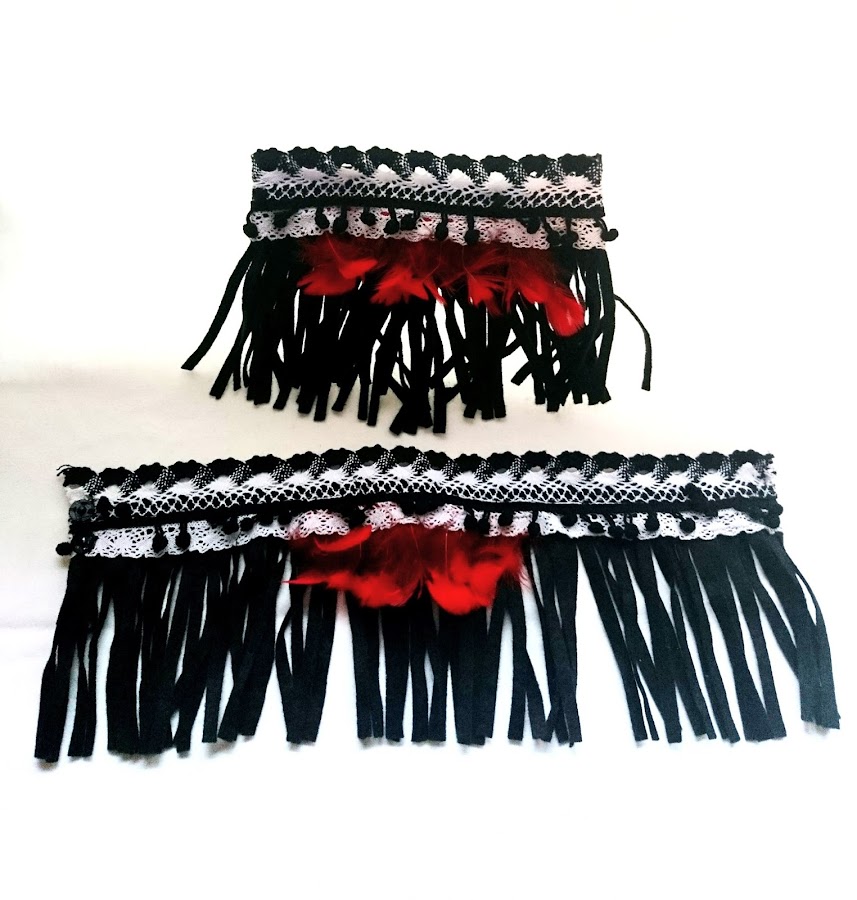 Si preferís usar flecos ya hechos de cuero, polipiel o de otro material, simplemente cortamos los rectangulos de fieltro con un ancho igual al de las puntillas unidas y añadimos los flecos.