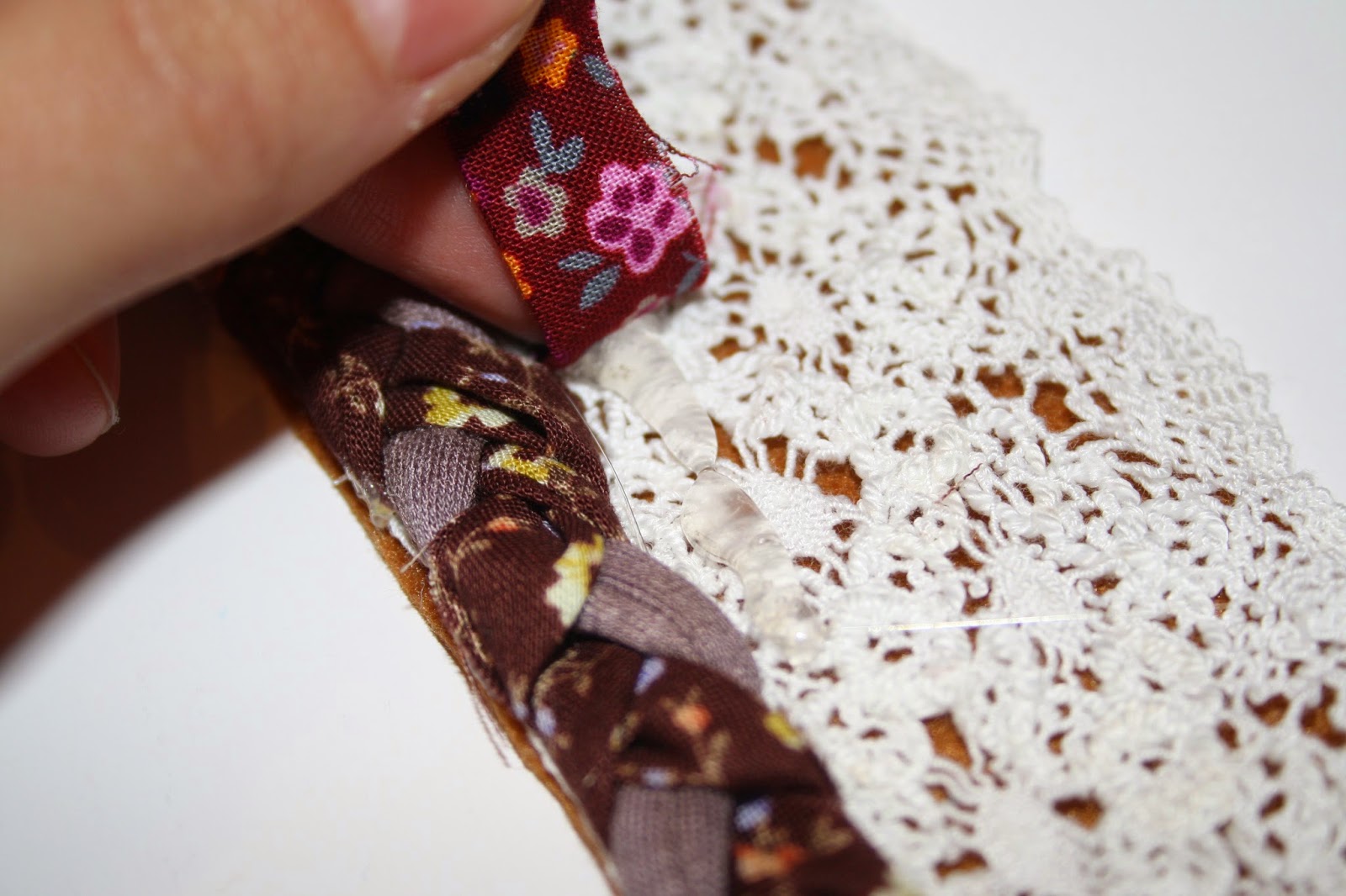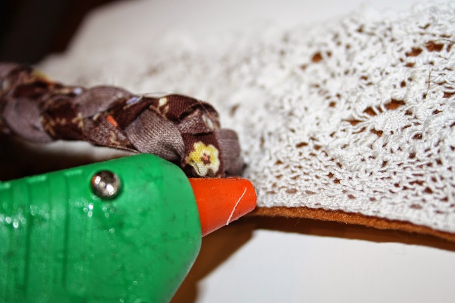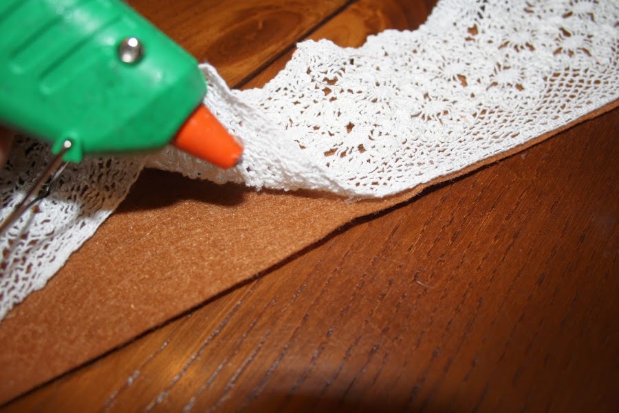 Comenzamos pegando con cuidado la cinta de encaje a la banda de fieltro.