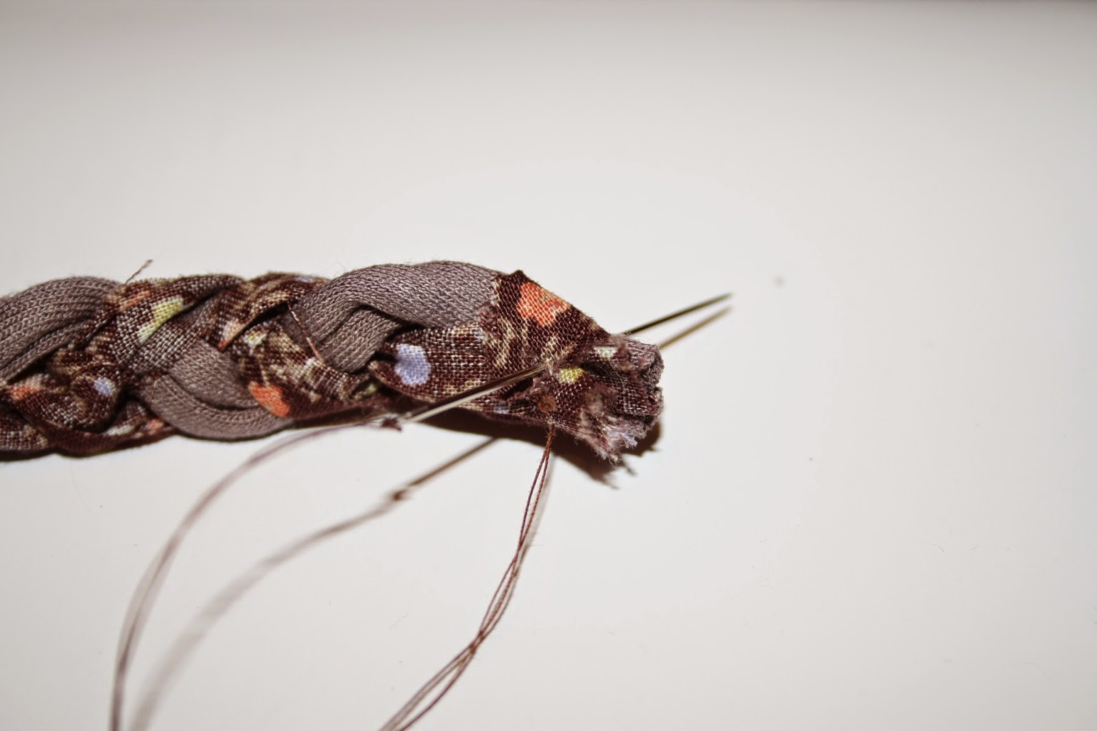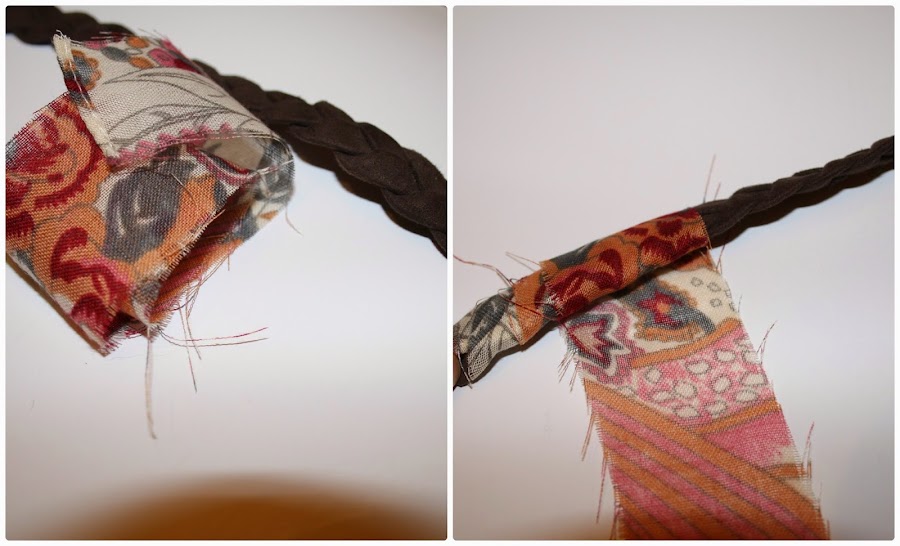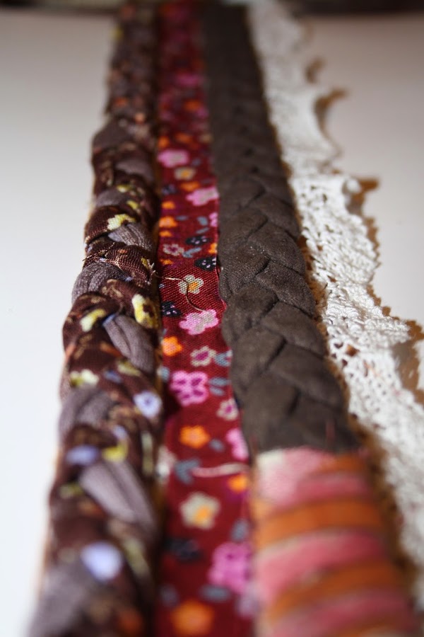 Hacemos una trenza con trapillo y tela y damos unas puntadas al principio y al final para que no se nos deshaga. Si no tenéis trapillo vale lana gorda o cordón de cualquier tipo o utilizad la imaginación....¡¡¡seguro que sale de lujo!!!