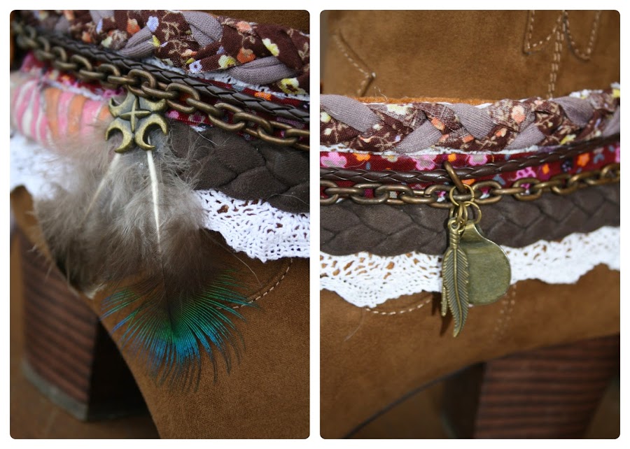 Colocaremos la cinta con abalorios o plumas al final y pegaremos solo por los extremos, ya que queremos conseguir que los cordones con los accesorios se "muevan" por encima del cubrebotas.