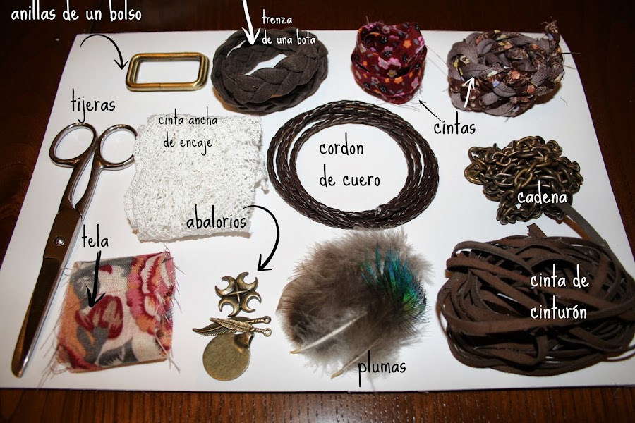 La mayoría de los materiales los he reciclado de cinturones viejos, bolsos, telas antiguas, restos de bisutería no usada, algún tapete roto....Recordad que cualquier cosa que no uséis, siempre nos vale para cualquier Diy.
