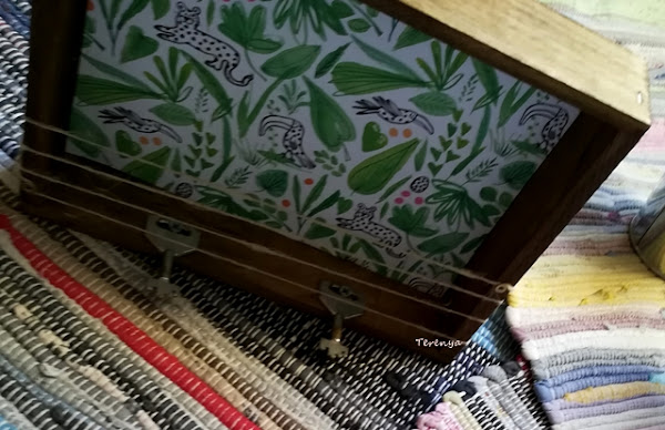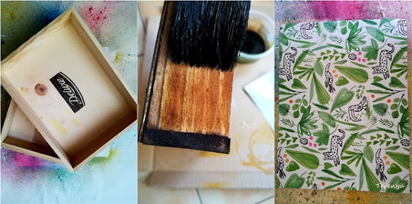 Después de limpiar bien la caja, le he dado una capa de tinte para madera (lo tengo del sorteo que me tocó de La libélula que reinventa sus trastos y me encanta!!). Mientras se secaba he buscado una lámina bonita y divertida y la he recortado a la medida del fondo de la caja.