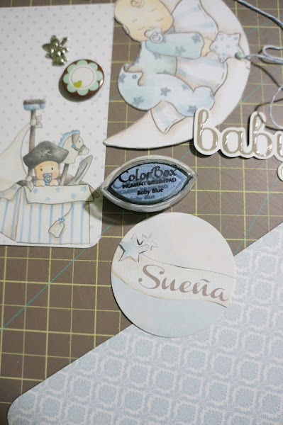 Para el DÍA he utilizado una de las ilustraciones y sobre ella he puesto la decoración, una cinta zig-zag, un brad y un cartelito con letras de Basic Grey. El baby está resaltado con Glossy Accent.